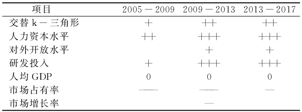 项目2005-20092009-20132013-2017交替k-三角形+++++人力资本水平++++++++对外开放水平++研发投入+++++++人均GDP000市场占有率———————市场增长率—