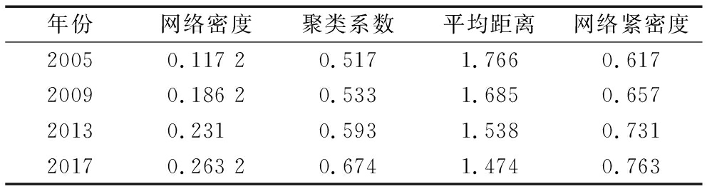 年份网络密度聚类系数平均距离网络紧密度20050.117 20.5171.7660.61720090.186 20.5331.6850.65720130.2310.5931.5380.73120170.263 20.6741.4740.763