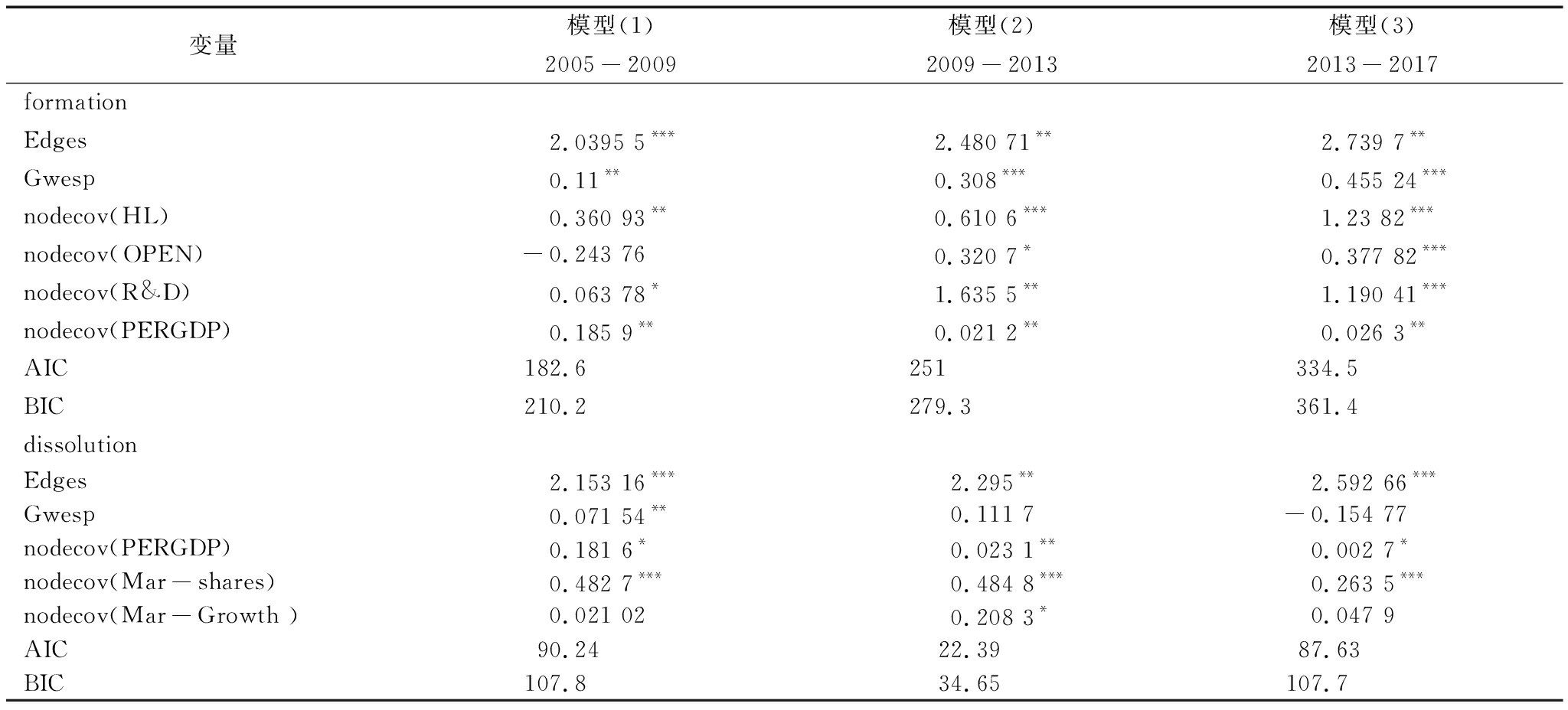 变量模型(1)2005-2009模型(2)2009-2013模型(3)2013-2017formationEdges2.0395 5***2.480 71**2.739 7**Gwesp0.11**0.308***0.455 24***nodecov(HL)0.360 93**0.610 6***1.23 82***nodecov(OPEN)-0.243 760.320 7*0.377 82***nodecov(R&D)0.063 78*1.635 5**1.190 41***nodecov(PERGDP)0.185 9**0.021 2**0.026 3**AIC182.6251334.5BIC210.2279.3361.4dissolutionEdges2.153 16***2.295**2.592 66***Gwesp0.071 54**0.111 7-0.154 77nodecov(PERGDP)0.181 6*0.023 1**0.002 7*nodecov(Mar-shares)0.482 7***0.484 8***0.263 5***nodecov(Mar-Growth )0.021 020.208 3*0.047 9AIC90.2422.3987.63BIC107.834.65107.7