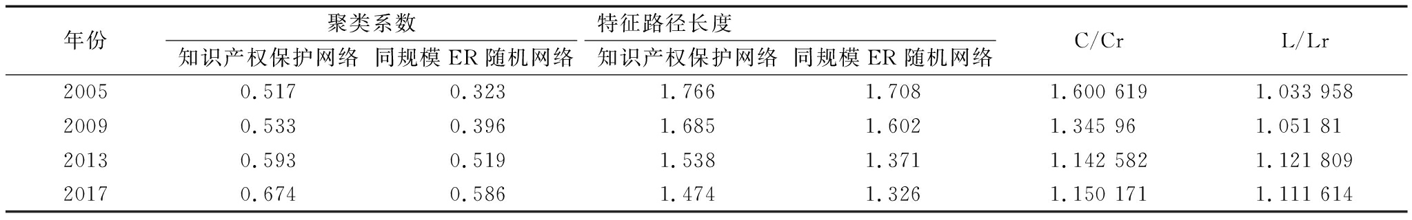 首先,借助Ucinet软件模拟出与知识产权保护网络相同规模的ER随机网络,然后计算出C和Cr、L和Lr并进行比较[25],结果如表3所示。