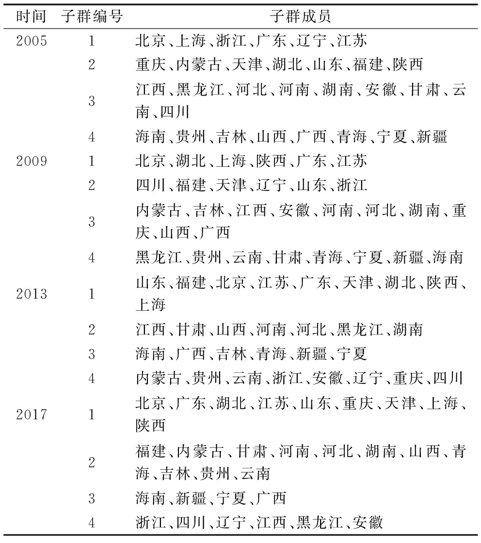 时间子群编号子群成员20051北京、上海、浙江、广东、辽宁、江苏2重庆、内蒙古、天津、湖北、山东、福建、陕西3江西、黑龙江、河北、河南、湖南、安徽、甘肃、云南、四川4海南、贵州、吉林、山西、广西、青海、宁夏、新疆20091北京、湖北、上海、陕西、广东、江苏2四川、福建、天津、辽宁、山东、浙江3内蒙古、吉林、江西、安徽、河南、河北、湖南、重庆、山西、广西4黑龙江、贵州、云南、甘肃、青海、宁夏、新疆、海南20131山东、福建、北京、江苏、广东、天津、湖北、陕西、上海2江西、甘肃、山西、河南、河北、黑龙江、湖南3海南、广西、吉林、青海、新疆、宁夏4内蒙古、贵州、云南、浙江、安徽、辽宁、重庆、四川20171北京、广东、湖北、江苏、山东、重庆、天津、上海、陕西2福建、内蒙古、甘肃、河南、河北、湖南、山西、青海、吉林、贵州、云南3海南、新疆、宁夏、广西4浙江、四川、辽宁、江西、黑龙江、安徽