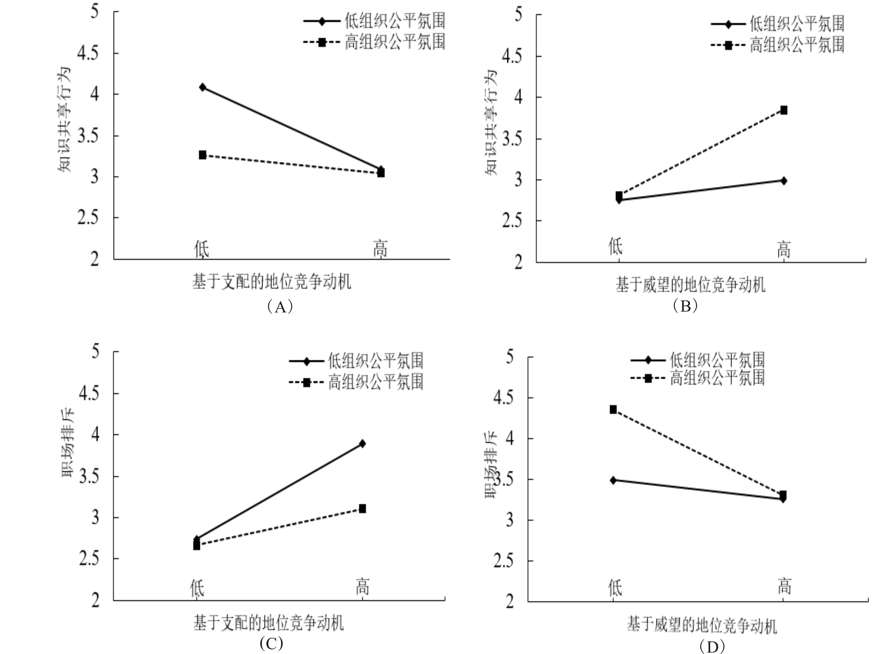 本研究依据温忠麟、张雷和侯杰泰[42]建议的方法,检验组织公平氛围在地位竞争动机与职场排斥和知识共享行为间关系中的调节效应。为了避免共线性问题,在调节效应回归分析之前,对自变量和调节变量进行中心化处理。表4结果表明,支配型地位竞争动机与组织公平氛围对知识共享行为的交互作用显著(M7,β=0.196,p<0.001),威望型地位竞争动机与组织公平氛围对知识共享行为的交互作用显著(M8,β=0.201,p<0.001),说明地位竞争动机与知识共享行为的关系受组织公平氛围影响,H4a、H4b得到验证,二者交互影响关系见组织公平氛围调节效应图2(A)、图2(B)。同样,支配型地位竞争动机与组织公平氛围对职场排斥的交互作用显著(M9,β=-0.178,p<0.001),威望型地位竞争动机与组织公平氛围对职场排斥的交互作用显著(M10,β=-0.203,p<0.001),说明地位竞争动机与职场排斥的关系受组织公平氛围影响,H5a、H5b得到验证,二者交互影响关系见组织公平氛围调节效应图2(C)、图2(D)。