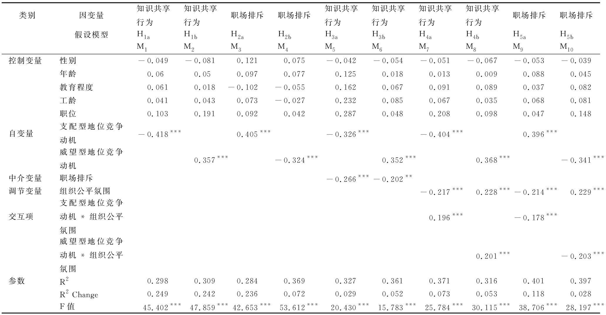类别因变量知识共享行为知识共享行为职场排斥职场排斥知识共享行为知识共享行为知识共享行为知识共享行为职场排斥职场排斥假设模型H1aH1bH2aH2bH3aH3bH4aH4bH5aH5b M1M2M3M4M5M6M7M8M9M10控制变量性别-0.049-0.0810.1210.075-0.042-0.054-0.051-0.067-0.053-0.039年龄0.060.050.0970.0770.1250.0180.0130.0090.0880.045教育程度0.0610.018-0.102-0.0550.1620.0670.0910.0890.0370.082工龄0.0410.0430.073-0.0270.2320.0850.0670.0350.0680.081职位0.1030.1910.0920.0420.2870.0480.2080.0980.0470.148自变量支配型地位竞争动机-0.418***0.405***-0.326***-0.404***0.396***威望型地位竞争动机0.357***-0.324***0.352***0.368***-0.341***中介变量职场排斥-0.266***-0.202**调节变量组织公平氛围-0.217***0.228***-0.214***0.229***交互项支配型地位竞争动机*组织公平氛围0.196***-0.178***威望型地位竞争动机*组织公平氛围0.201***-0.203***参数R20.2980.3090.2840.3690.3270.3610.3710.3160.4010.397R2 Change0.2490.2420.2360.0720.0290.0520.0730.0530.1180.028F值45.402***47.859***42.653***53.612***20.430***15.783***25.784***30.115***38.706***28.197***