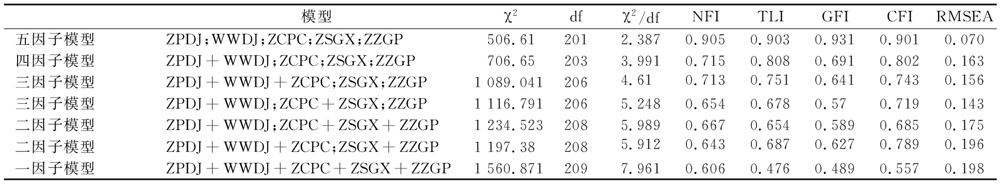 模型χ2dfχ2/dfNFITLIGFICFIRMSEA五因子模型ZPDJ;WWDJ;ZCPC;ZSGX;ZZGP506.612012.3870.9050.9030.9310.9010.070四因子模型ZPDJ+WWDJ;ZCPC;ZSGX;ZZGP706.652033.9910.7150.8080.6910.8020.163三因子模型ZPDJ+WWDJ+ZCPC;ZSGX;ZZGP1 089.0412064.610.7130.7510.6410.7430.156三因子模型ZPDJ+WWDJ;ZCPC+ZSGX;ZZGP 1 116.7912065.2480.6540.6780.570.7190.143二因子模型ZPDJ+WWDJ;ZCPC+ZSGX+ZZGP1 234.5232085.9890.6670.6540.5890.6850.175二因子模型ZPDJ+WWDJ+ZCPC;ZSGX+ZZGP1 197.382085.9120.6430.6870.6270.7890.196一因子模型ZPDJ+WWDJ+ZCPC+ZSGX+ZZGP1 560.8712097.9610.6060.4760.4890.5570.198