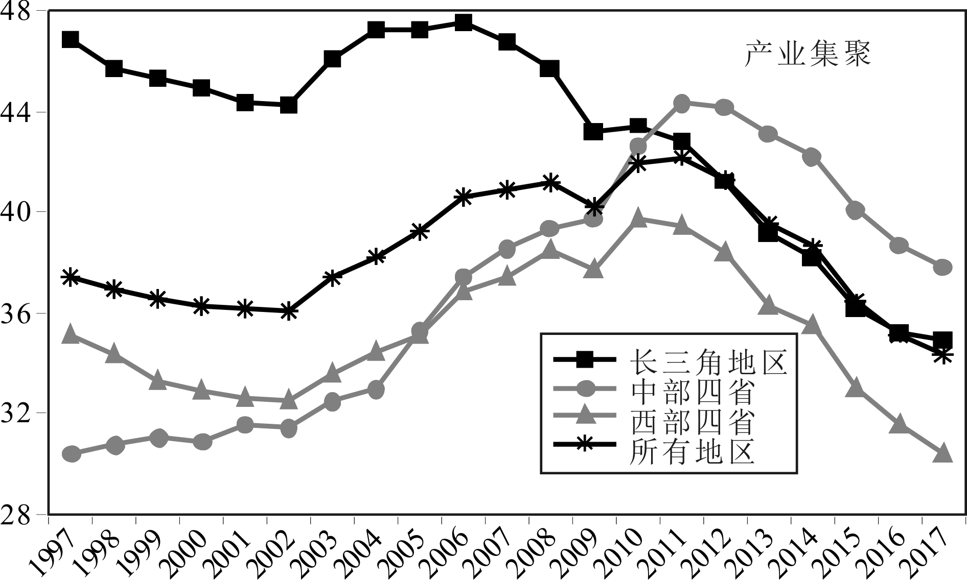 图3 长江经济带及其长三角地区、中部四省与西部四省产业集聚情况(1997—2017年)
