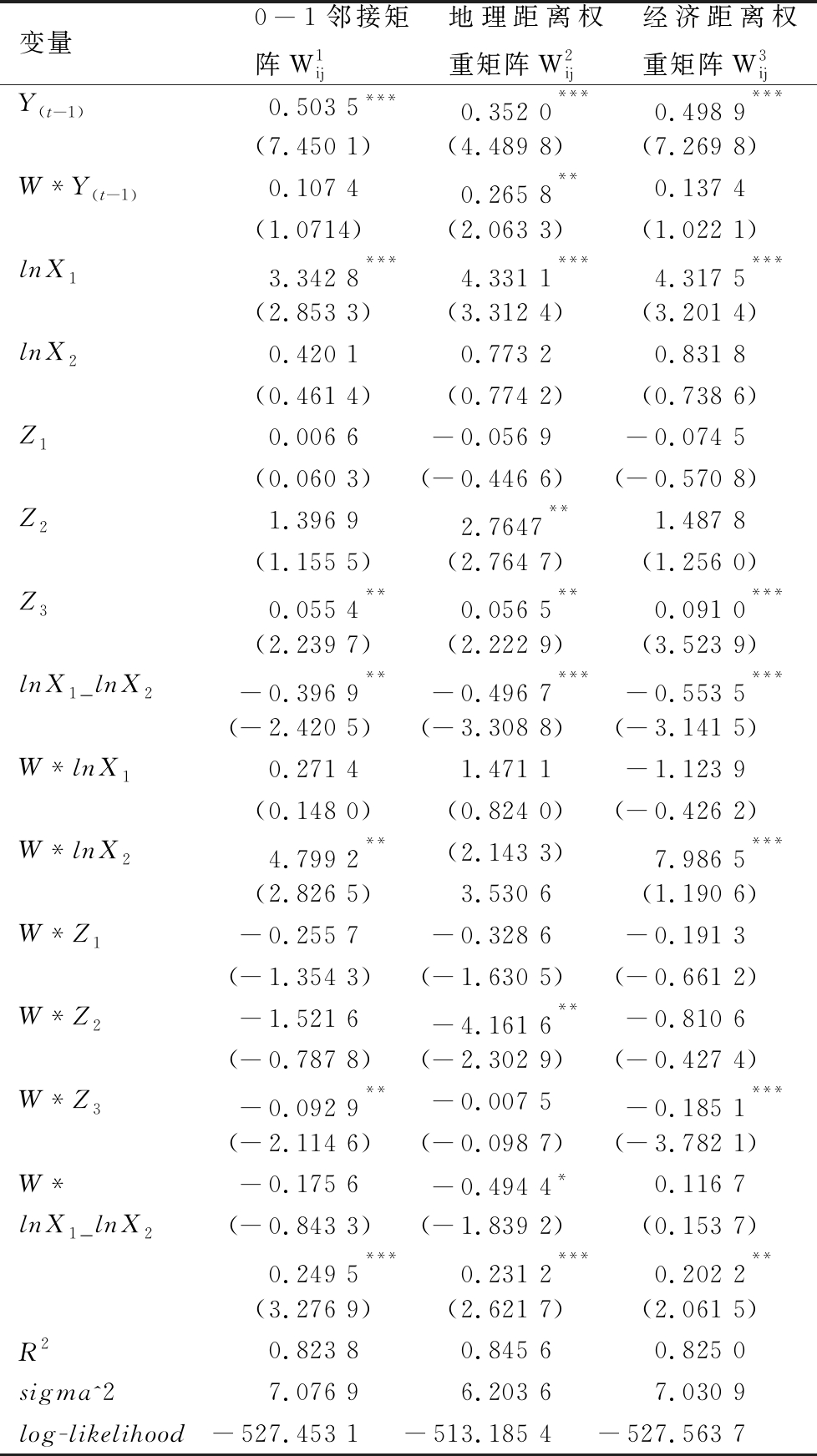 变量0-1邻接矩阵W1ij地理距离权重矩阵W2ij经济距离权重矩阵W3ijY(t-1)0.503 5***0.352 0***0.498 9***(7.450 1)(4.489 8)(7.269 8)W*Y(t-1)0.107 40.265 8**0.137 4(1.0714)(2.063 3)(1.022 1)lnX13.342 8***4.331 1***4.317 5***(2.853 3)(3.312 4)(3.201 4)lnX20.420 10.773 20.831 8(0.461 4)(0.774 2)(0.738 6)Z10.006 6-0.056 9-0.074 5(0.060 3)(-0.446 6)(-0.570 8)Z21.396 92.7647**1.487 8(1.155 5)(2.764 7)(1.256 0)Z30.055 4**0.056 5**0.091 0***(2.239 7)(2.222 9)(3.523 9)lnX1_lnX2-0.396 9**-0.496 7***-0.553 5***(-2.420 5)(-3.308 8)(-3.141 5)W*lnX10.271 41.471 1-1.123 9(0.148 0)(0.824 0)(-0.426 2)W*lnX24.799 2**(2.143 3)7.986 5***(2.826 5)3.530 6(1.190 6)W*Z1-0.255 7-0.328 6-0.191 3(-1.354 3)(-1.630 5)(-0.661 2)W*Z2-1.521 6-4.161 6**-0.810 6(-0.787 8)(-2.302 9)(-0.427 4)W*Z3-0.092 9**-0.007 5-0.185 1***(-2.114 6)(-0.098 7)(-3.782 1)W*-0.175 6-0.494 4*0.116 7lnX1_lnX2(-0.843 3)(-1.839 2)(0.153 7) 0.249 5***0.231 2***0.202 2**(3.276 9)(2.621 7)(2.061 5)R20.823 80.845 60.825 0sigma^27.076 96.203 67.030 9log-likelihood-527.453 1-513.185 4-527.563 7