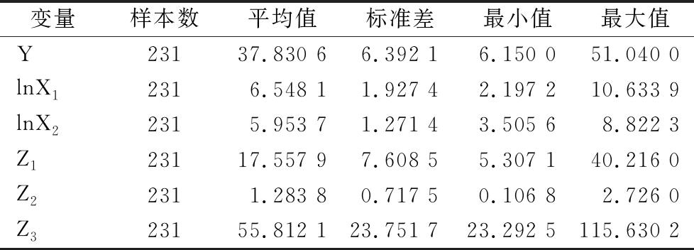 变量样本数平均值标准差最小值最大值Y23137.830 66.392 16.150 051.040 0lnX12316.548 11.927 42.197 210.633 9lnX22315.953 71.271 43.505 68.822 3Z123117.557 97.608 55.307 140.216 0Z22311.283 80.717 50.106 82.726 0Z323155.812 123.751 723.292 5115.630 2