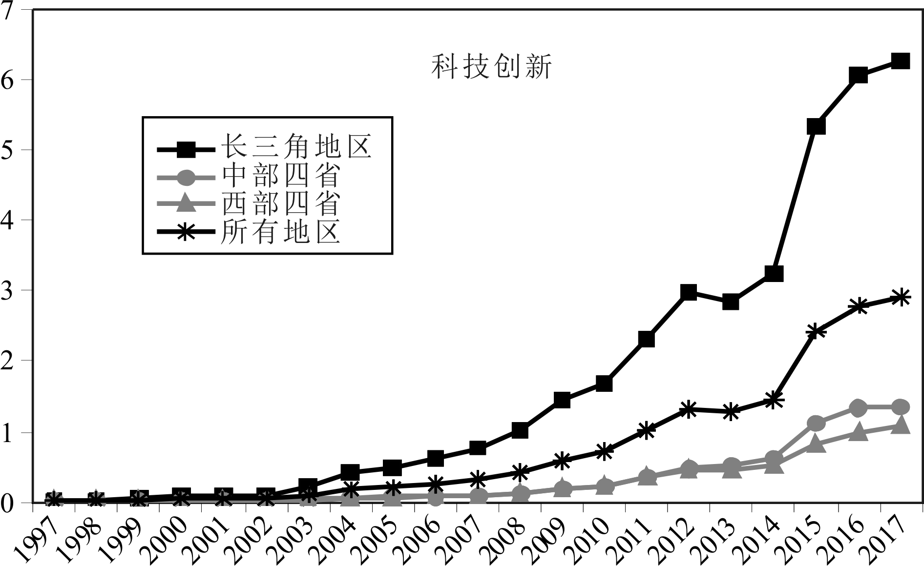 图1 长江经济带及其长三角地区、中部四省与西部四省科技创新情况(1997—2017年)