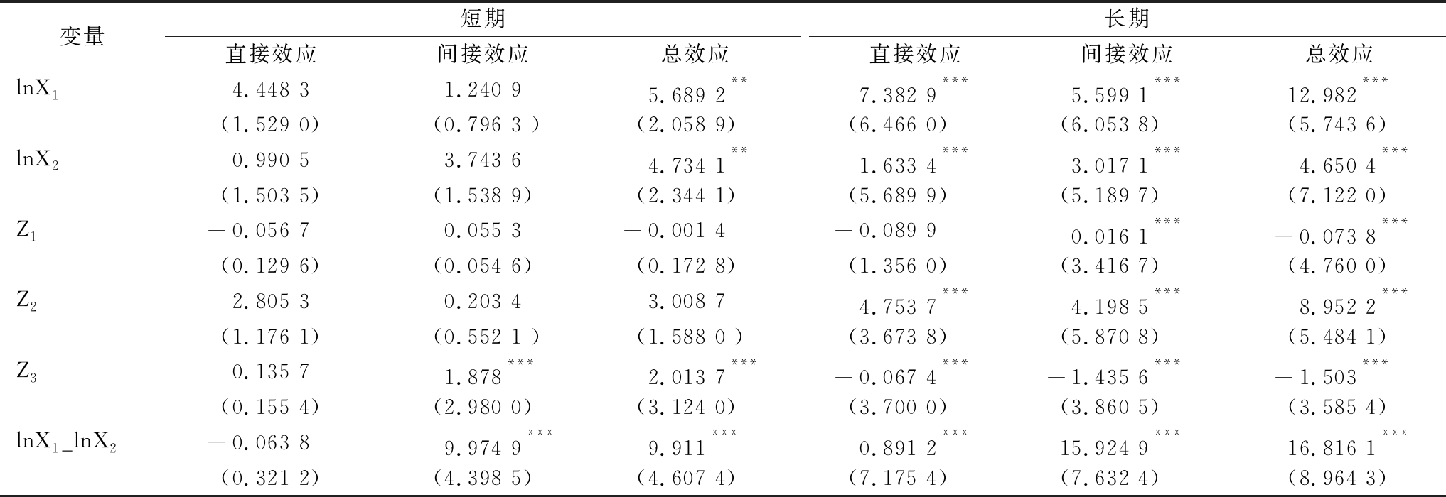 变量短期直接效应间接效应总效应长期直接效应间接效应总效应lnX14.448 31.240 95.689 2**7.382 9***5.599 1***12.982***(1.529 0)(0.796 3 )(2.058 9)(6.466 0)(6.053 8)(5.743 6)lnX20.990 53.743 64.734 1**1.633 4***3.017 1***4.650 4***(1.503 5)(1.538 9)(2.344 1)(5.689 9)(5.189 7)(7.122 0)Z1-0.056 70.055 3-0.001 4-0.089 90.016 1***-0.073 8***(0.129 6)(0.054 6)(0.172 8)(1.356 0)(3.416 7)(4.760 0)Z22.805 30.203 43.008 74.753 7***4.198 5***8.952 2***(1.176 1)(0.552 1 )(1.588 0 )(3.673 8)(5.870 8)(5.484 1)Z30.135 71.878***2.013 7***-0.067 4***-1.435 6***-1.503***(0.155 4)(2.980 0)(3.124 0)(3.700 0)(3.860 5)(3.585 4)lnX1_lnX2-0.063 89.974 9***9.911***0.891 2***15.924 9***16.816 1***(0.321 2)(4.398 5)(4.607 4)(7.175 4)(7.632 4)(8.964 3)