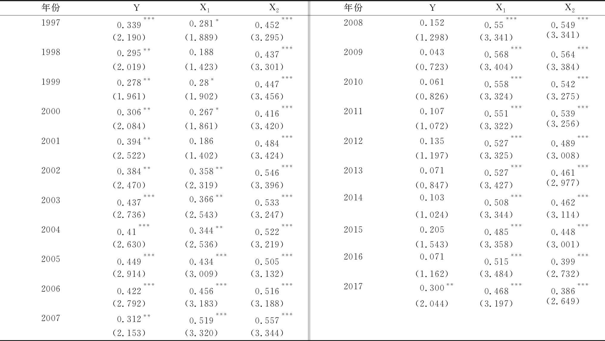年份YX1X2年份YX1X219970.339***0.281*0.452***20080.1520.55***0.549***(2.190)(1.889)(3.295)(1.298)(3.341)(3.341)19980.295**0.1880.437***20090.0430.568***0.564***(2.019)(1.423)(3.301)(0.723)(3.404)(3.384)19990.278**0.28*0.447***20100.0610.558***0.542***(1.961)(1.902)(3.456)(0.826)(3.324)(3.275)20000.306**0.267*0.416***20110.1070.551***0.539***(2.084)(1.861)(3.420)(1.072)(3.322)(3.256)20010.394**0.1860.484***20120.1350.527***0.489***(2.522)(1.402)(3.424)(1.197)(3.325)(3.008)20020.384**0.358**0.546***20130.0710.527***0.461***(2.470)(2.319)(3.396)(0.847)(3.427)(2.977)20030.437***0.366**0.533***20140.1030.508***0.462***(2.736)(2.543)(3.247)(1.024)(3.344)(3.114)20040.41***0.344**0.522***20150.2050.485***0.448***(2.630)(2.536)(3.219)(1.543)(3.358)(3.001)20050.449***0.434***0.505***20160.0710.515***0.399***(2.914)(3.009)(3.132)(1.162)(3.484)(2.732)20060.422***0.456***0.516***20170.300**0.468***0.386***(2.792)(3.183)(3.188)(2.044)(3.197)(2.649)20070.312**0.519***0.557***(2.153)(3.320)(3.344)