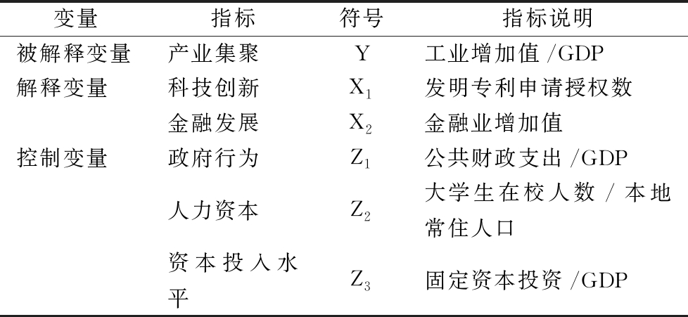 变量指标符号指标说明被解释变量产业集聚Y工业增加值/GDP解释变量科技创新X1发明专利申请授权数金融发展X2金融业增加值控制变量政府行为Z1公共财政支出/GDP人力资本Z2大学生在校人数/本地常住人口资本投入水平Z3固定资本投资/GDP