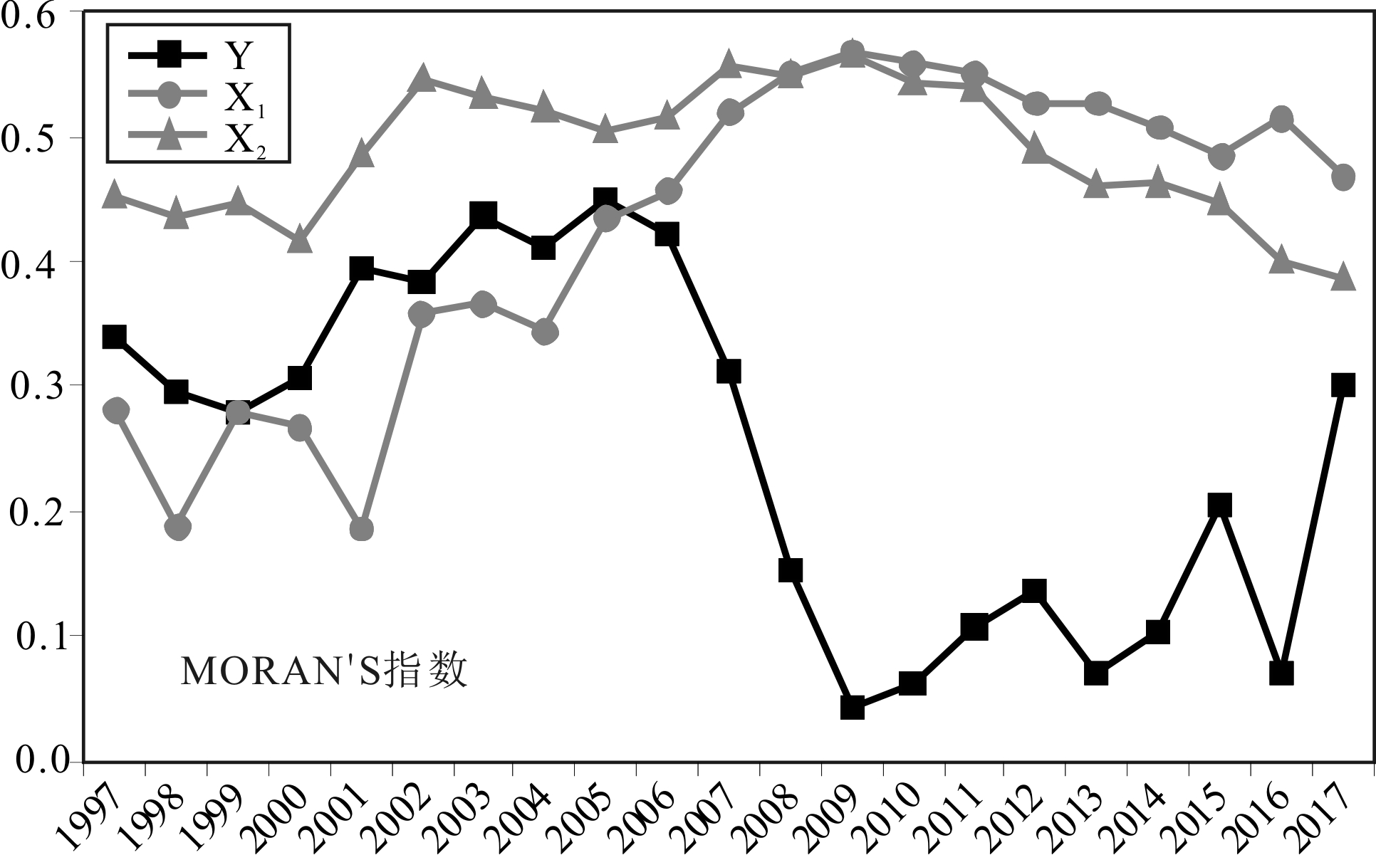 为了进一步验证长江经济带产业集聚(Y)、科技创新(X1)和金融发展(X2)的空间相关性,制作长江经济带产业集聚(Y)、科技创新(X1)和金融发展(X2)的Moran' s I指数发展变化趋势折线图(图4)。图4显示,1997-1999年,长江经济带产业集聚(Y)逐年下降,原因是当时长江经济带沿线省市工业尚不发达,产业发展分散,因此,产业集聚度下降。2000-2005年,产业集聚逐年上升,这一时期正是相关省市工业企业大发展时期,工业占GDP比重持续上升,因此,显示出产业集聚度上升。2006-2009年,正值国家对传统工业实行限产减亏的关键时期,因此,显示出产业集聚度下降。2009年以来,新型产业逐年发展,传统产业转型升级加快,产业集聚度整体上升,波折前行。2016年以来,随着产业转型升级完成,新型产业快速发展,产业集聚度直线上升。从科技创新发展来看,呈现波折前行、总体上升趋势;从金融发展水平看,1997-2000年总体发展平稳,2000-2002年直线上升,2002年以来,稳中有降,总体上反映了金融产业由暖转冷趋势。