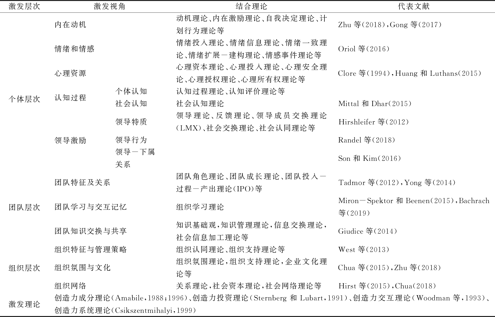激发层次激发视角结合理论代表文献个体层次内在动机动机理论、内在激励理论、自我决定理论、计划行为理论等Zhu等(2018),Gong等(2017)情绪和情感情绪投入理论、情绪信息理论、情绪一致理论、情绪扩展-建构理论、情感事件理论等Oriol等(2016)心理资源心理资本理论、心理投入理论、心理安全理论、心理授权理论、心理所有权理论等Clore等(1994),Huang和Luthans(2015)认知过程个体认知认知过程理论、认知评价理论等社会认知社会认知理论Mittal和Dhar(2015)领导激励领导特质领导理论、反馈理论、领导成员交换理论(LMX)、社会交换理论、社会认同理论等Hirshleifer等(2012)领导行为Randel等(2018)领导-下属关系Son和Kim(2016)团队层次团队特征及关系团队角色理论、团队成长理论、团队投入-过程-产出理论(IPO)等Tadmor等(2012),Yong等(2014)团队学习与交互记忆组织学习理论Miron-Spektor和Beenen(2015),Bachrach等(2019)团队知识交换与共享知识基础观,知识管理理论,信息交换理论,社会信息加工理论等Giudice等(2014)组织层次组织特征与管理策略组织认同理论、组织支持理论等West等(2013)组织氛围与文化组织氛围理论,组织支持理论,企业文化理论等Chua等(2015),Zhu等(2018)组织网络关系理论,社会资本理论,社会网络理论等Hirst等(2015),Chua(2018)激发理论创造力成分理论(Amabile,1988;1996)、创造力投资理论(Sternberg和Lubart,1991)、创造力交互理论(Woodman等,1993)、创造力系统理论(Csikszentmihalyi,1999)