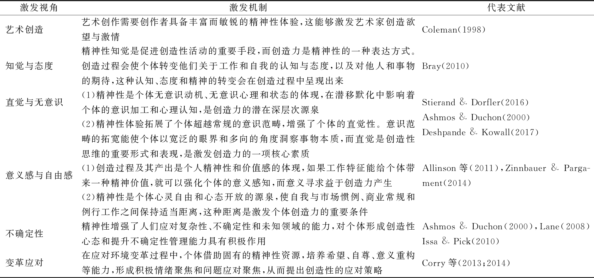 激发视角激发机制代表文献艺术创造 艺术创作需要创作者具备丰富而敏锐的精神性体验,这能够激发艺术家创造欲望与激情Coleman(1998)知觉与态度 精神性知觉是促进创造性活动的重要手段,而创造力是精神性的一种表达方式。创造过程会使个体转变他们关于工作和自我的认知与态度,以及对他人和事物的期待,这种认知、态度和精神的转变会在创造过程中呈现出来Bray(2010)直觉与无意识 (1)精神性是个体无意识动机、无意识心理和状态的体现,在潜移默化中影响着个体的意识加工和心理认知,是创造力的潜在深层次源泉Stierand & Dorfler(2016)Ashmos & Duchon(2000)Deshpande & Kowall(2017)(2)精神性体验拓展了个体超越常规的意识范畴,增强了个体的直觉性。意识范畴的拓宽能使个体以宽泛的眼界和多向的角度洞察事物本质,而直觉是创造性思维的重要形式和表现,是激发创造力的一项核心素质意义感与自由感(1)创造过程及其产出是个人精神性和价值感的体现,如果工作特征能给个体带来一种精神价值,就可以强化个体的意义感知,而意义寻求益于创造力产生Allinson等(2011),Zinnbauer & Parga-ment(2014)(2)精神性是个体心灵自由和心态开放的源泉,使自我与市场惯例、商业常规和例行工作之间保持适当距离,这种距离是激发个体创造力的重要条件不确定性 精神性增强了人们应对复杂性、不确定性和未知领域的能力,对个体形成创造性心态和提升不确定性管理能力具有积极作用Ashmos & Duchon(2000),Lane(2008)Issa & Pick(2010)变革应对 在应对环境变革过程中,个体借助固有的精神性资源,培养希望、自尊、意义重构等能力,形成积极情绪聚焦和问题应对聚焦,从而提出创造性的应对策略Corry等(2013;2014)