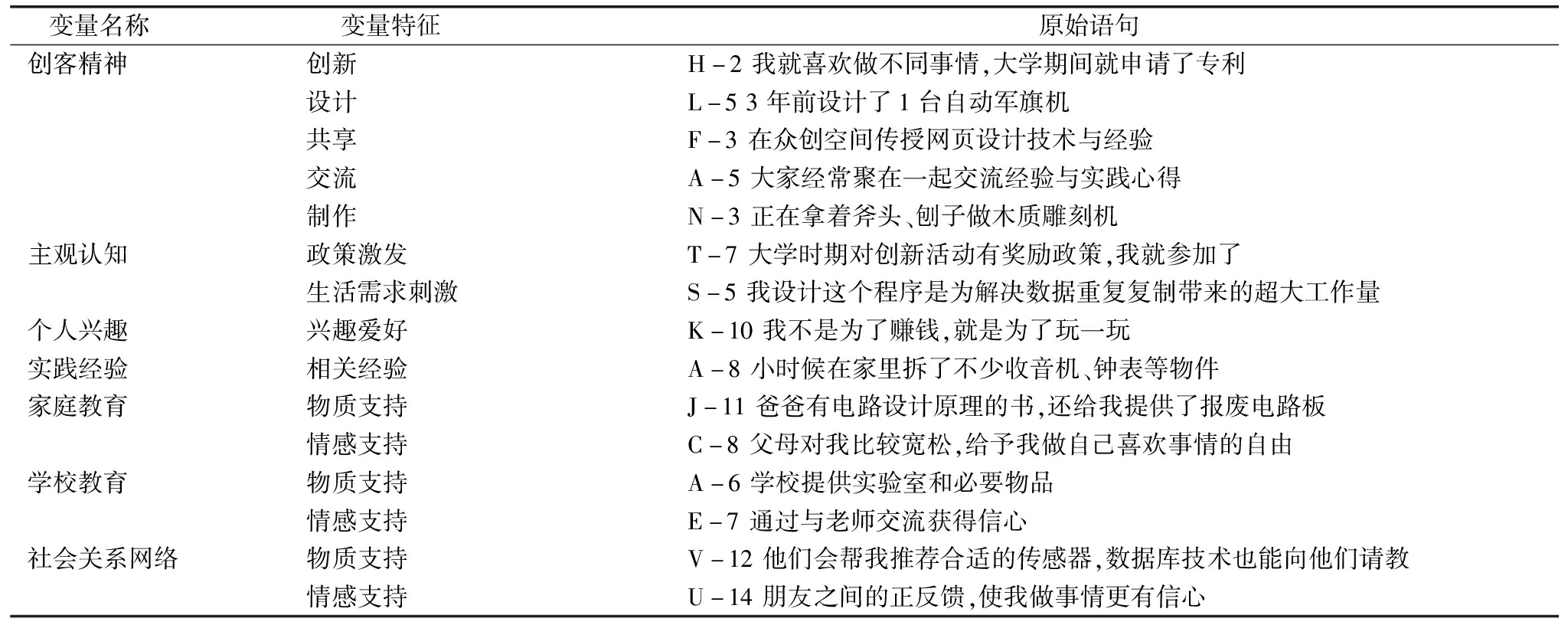 变量名称 变量特征 原始语句 创客精神创新H-2我就喜欢做不同事情,大学期间就申请了专利设计L-53年前设计了1台自动军旗机共享F-3在众创空间传授网页设计技术与经验交流A-5大家经常聚在一起交流经验与实践心得制作N-3正在拿着斧头、刨子做木质雕刻机主观认知政策激发T-7大学时期对创新活动有奖励政策,我就参加了生活需求刺激S-5我设计这个程序是为解决数据重复复制带来的超大工作量个人兴趣兴趣爱好K-10我不是为了赚钱,就是为了玩一玩实践经验相关经验A-8小时候在家里拆了不少收音机、钟表等物件家庭教育物质支持J-11爸爸有电路设计原理的书,还给我提供了报废电路板情感支持C-8父母对我比较宽松,给予我做自己喜欢事情的自由学校教育物质支持A-6学校提供实验室和必要物品情感支持E-7通过与老师交流获得信心社会关系网络物质支持V-12他们会帮我推荐合适的传感器,数据库技术也能向他们请教情感支持U-14朋友之间的正反馈,使我做事情更有信心