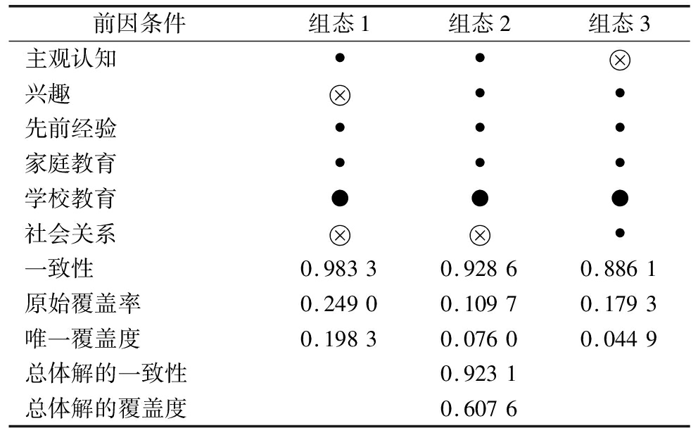 前因条件组态1组态2组态3主观认知•• 兴趣 ••先前经验•••家庭教育•••学校教育●●●社会关系 •一致性0.98330.92860.8861原始覆盖率0.24900.10970.1793唯一覆盖度0.19830.07600.0449总体解的一致性0.9231总体解的覆盖度0.6076