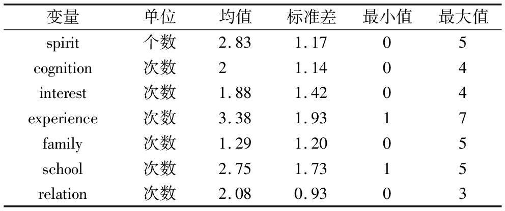 变量单位均值标准差最小值最大值spirit个数2.831.1705cognition次数21.1404interest次数1.881.4204experience次数3.381.9317family次数1.291.2005school次数2.751.7315relation次数2.080.9303