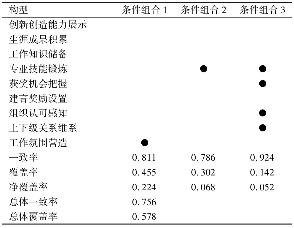 构型条件组合1条件组合2条件组合3创新创造能力展示生涯成果积累工作知识储备专业技能锻炼●●获奖机会把握●建言奖励设置组织认可感知●上下级关系维系●工作氛围营造●一致率0.8110.7860.924覆盖率0.4550.3020.142净覆盖率0.2240.0680.052总体一致率0.756总体覆盖率0.578