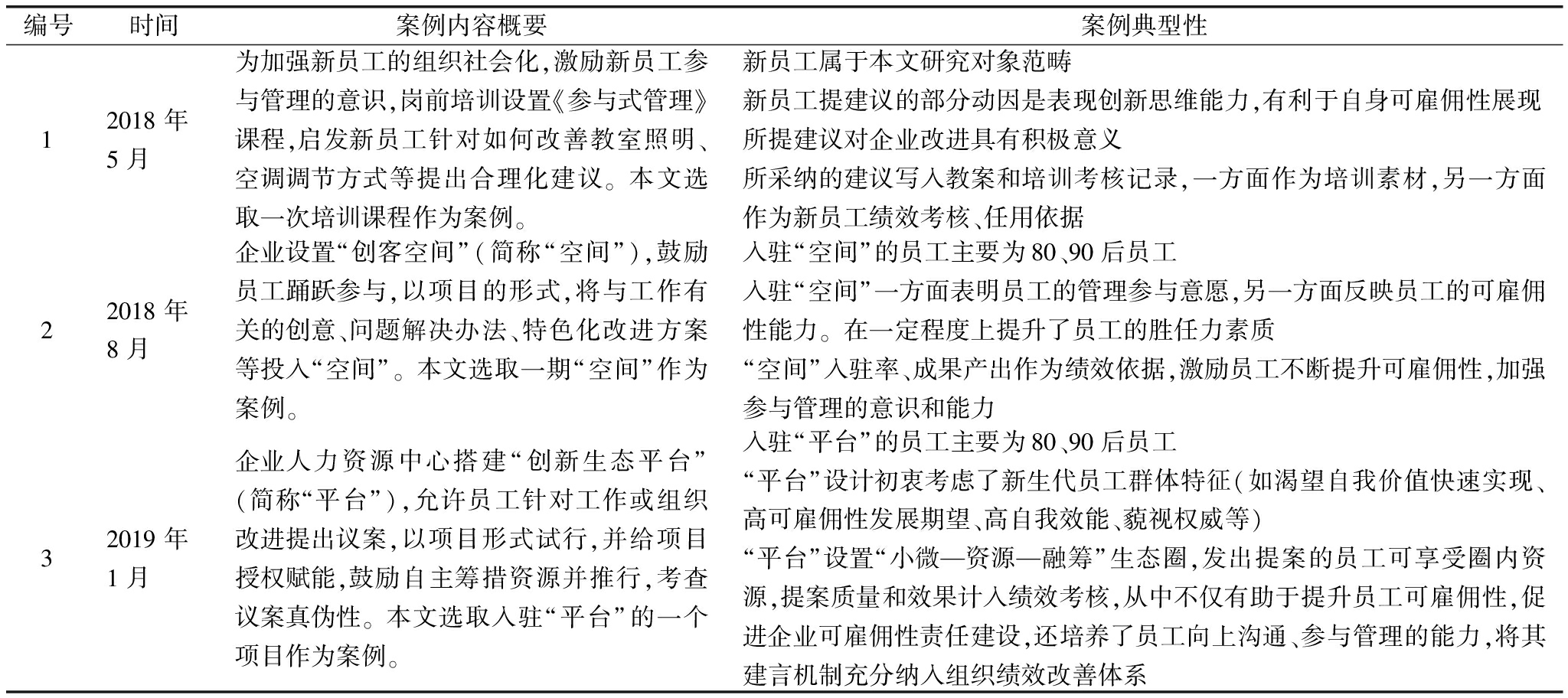编号时间案例内容概要案例典型性12018年5月为加强新员工的组织社会化,激励新员工参与管理的意识,岗前培训设置《参与式管理》课程,启发新员工针对如何改善教室照明、空调调节方式等提出合理化建议。本文选取一次培训课程作为案例。新员工属于本文研究对象范畴新员工提建议的部分动因是表现创新思维能力,有利于自身可雇佣性展现所提建议对企业改进具有积极意义所采纳的建议写入教案和培训考核记录,一方面作为培训素材,另一方面作为新员工绩效考核、任用依据22018年8月企业设置“创客空间”(简称“空间”),鼓励员工踊跃参与,以项目的形式,将与工作有关的创意、问题解决办法、特色化改进方案等投入“空间”。本文选取一期“空间”作为案例。入驻“空间”的员工主要为80、90后员工入驻“空间”一方面表明员工的管理参与意愿,另一方面反映员工的可雇佣性能力。在一定程度上提升了员工的胜任力素质“空间”入驻率、成果产出作为绩效依据,激励员工不断提升可雇佣性,加强参与管理的意识和能力32019年1月企业人力资源中心搭建“创新生态平台”(简称“平台”),允许员工针对工作或组织改进提出议案,以项目形式试行,并给项目授权赋能,鼓励自主筹措资源并推行,考查议案真伪性。本文选取入驻“平台”的一个项目作为案例。入驻“平台”的员工主要为80、90后员工“平台”设计初衷考虑了新生代员工群体特征(如渴望自我价值快速实现、高可雇佣性发展期望、高自我效能、藐视权威等)“平台”设置“小微—资源—融筹”生态圈,发出提案的员工可享受圈内资源,提案质量和效果计入绩效考核,从中不仅有助于提升员工可雇佣性,促进企业可雇佣性责任建设,还培养了员工向上沟通、参与管理的能力,将其建言机制充分纳入组织绩效改善体系