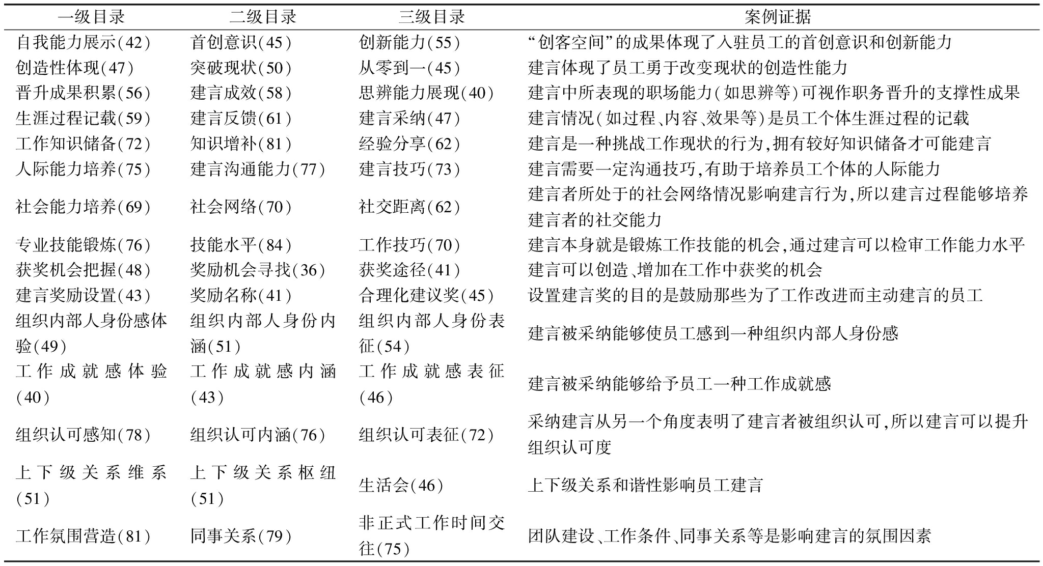 一级目录二级目录三级目录案例证据自我能力展示(42)首创意识(45)创新能力(55)“创客空间”的成果体现了入驻员工的首创意识和创新能力创造性体现(47)突破现状(50)从零到一(45)建言体现了员工勇于改变现状的创造性能力晋升成果积累(56)建言成效(58)思辨能力展现(40)建言中所表现的职场能力(如思辨等)可视作职务晋升的支撑性成果生涯过程记载(59)建言反馈(61)建言采纳(47)建言情况(如过程、内容、效果等)是员工个体生涯过程的记载工作知识储备(72)知识增补(81)经验分享(62)建言是一种挑战工作现状的行为,拥有较好知识储备才可能建言人际能力培养(75)建言沟通能力(77)建言技巧(73)建言需要一定沟通技巧,有助于培养员工个体的人际能力社会能力培养(69)社会网络(70)社交距离(62)建言者所处于的社会网络情况影响建言行为,所以建言过程能够培养建言者的社交能力专业技能锻炼(76)技能水平(84)工作技巧(70)建言本身就是锻炼工作技能的机会,通过建言可以检审工作能力水平获奖机会把握(48)奖励机会寻找(36)获奖途径(41)建言可以创造、增加在工作中获奖的机会建言奖励设置(43)奖励名称(41)合理化建议奖(45)设置建言奖的目的是鼓励那些为了工作改进而主动建言的员工组织内部人身份感体验(49)组织内部人身份内涵(51)组织内部人身份表征(54)建言被采纳能够使员工感到一种组织内部人身份感工作成就感体验(40)工作成就感内涵(43)工作成就感表征(46)建言被采纳能够给予员工一种工作成就感组织认可感知(78)组织认可内涵(76)组织认可表征(72)采纳建言从另一个角度表明了建言者被组织认可,所以建言可以提升组织认可度上下级关系维系(51)上下级关系枢纽(51)生活会(46)上下级关系和谐性影响员工建言工作氛围营造(81)同事关系(79)非正式工作时间交往(75)团队建设、工作条件、同事关系等是影响建言的氛围因素