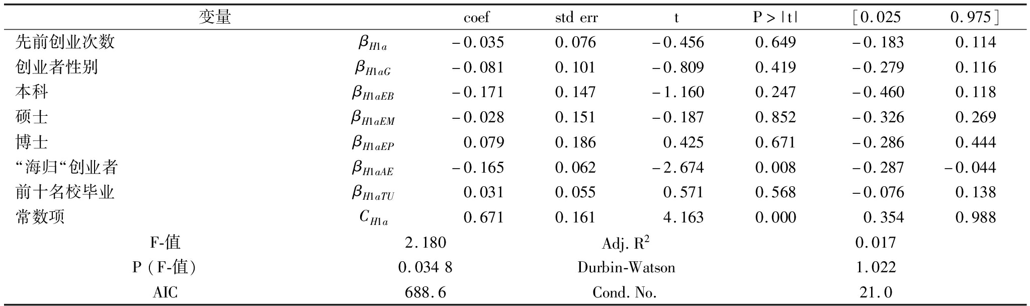 变量coefstderrtP>|t|[0.0250.975]先前创业次数βH1a-0.0350.076-0.4560.649-0.1830.114创业者性别βH1aG-0.0810.101-0.8090.419-0.2790.116本科βH1aEB-0.1710.147-1.1600.247-0.4600.118硕士βH1aEM-0.0280.151-0.1870.852-0.3260.269博士βH1aEP0.0790.1860.4250.671-0.2860.444“海归“创业者βH1aAE-0.1650.062-2.6740.008-0.287-0.044前十名校毕业βH1aTU0.0310.0550.5710.568-0.0760.138常数项CH1a0.6710.1614.1630.0000.3540.988F-值2.180Adj.R20.017P(F-值)0.0348Durbin-Watson1.022AIC688.6Cond.No.21.0