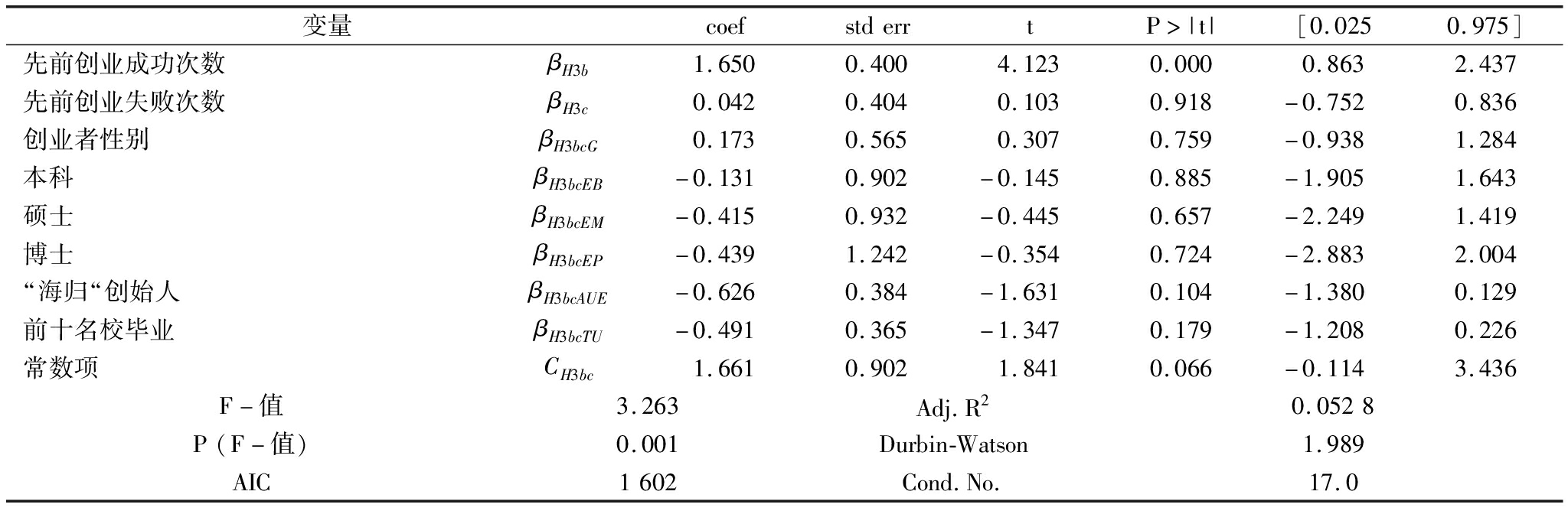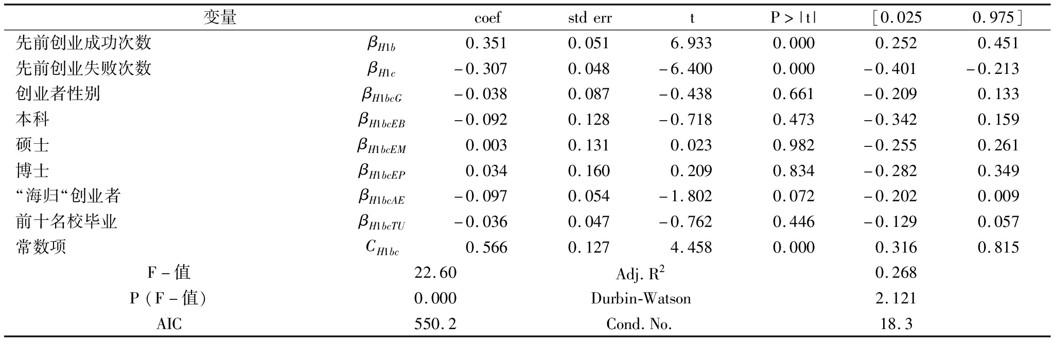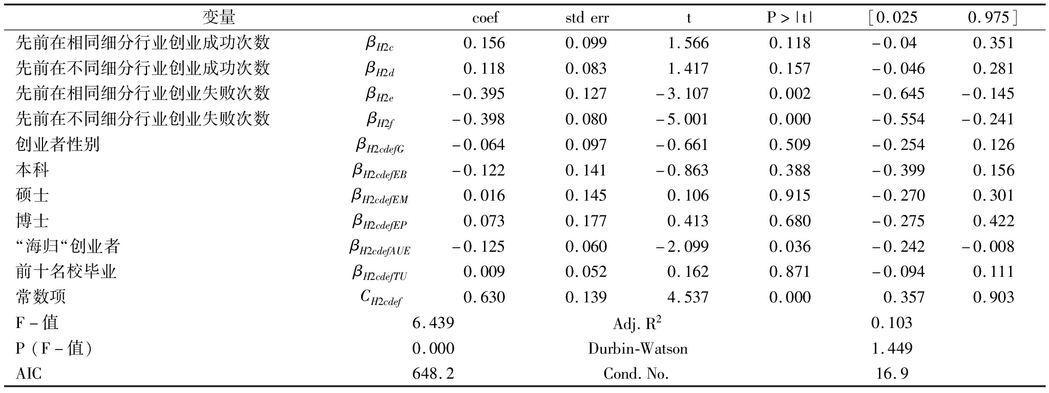 变量coefstderrtP>|t|[0.0250.975]先前在相同细分行业创业成功次数βH2c0.1560.0991.5660.118-0.040.351先前在不同细分行业创业成功次数βH2d0.1180.0831.4170.157-0.0460.281先前在相同细分行业创业失败次数βH2e-0.3950.127-3.1070.002-0.645-0.145先前在不同细分行业创业失败次数βH2f-0.3980.080-5.0010.000-0.554-0.241创业者性别βH2cdefG-0.0640.097-0.6610.509-0.2540.126本科βH2cdefEB-0.1220.141-0.8630.388-0.3990.156硕士βH2cdefEM0.0160.1450.1060.915-0.2700.301博士βH2cdefEP0.0730.1770.4130.680-0.2750.422“海归“创业者βH2cdefAUE-0.1250.060-2.0990.036-0.242-0.008前十名校毕业βH2cdefTU0.0090.0520.1620.871-0.0940.111常数项CH2cdef0.6300.1394.5370.0000.3570.903F-值6.439Adj.R20.103P(F-值)0.000Durbin-Watson1.449AIC648.2Cond.No.16.9