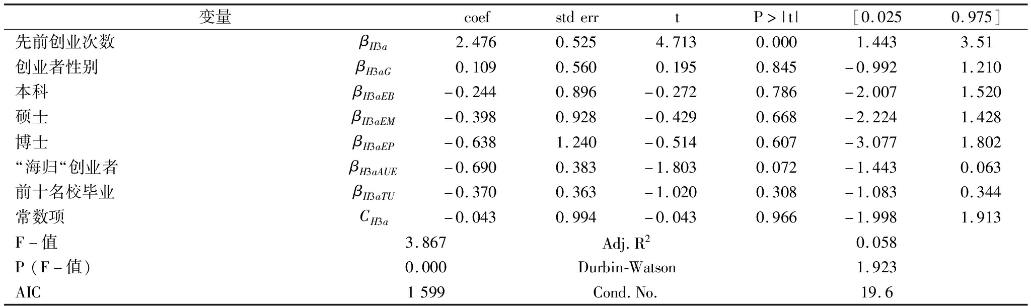 式(5)中,因变量YH3a是指创业公司从创建到收到第一笔投资的间隔年数;自变量A代表同一创业者先前创办过的公司数量,βH3a为自变量系数;CH3a为常数项。模型还包含所有4个控制变量及其系数。