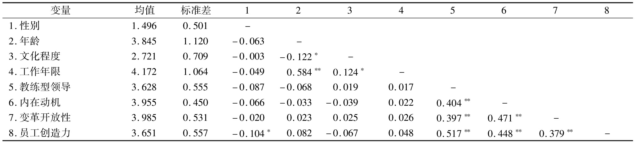 变量均值标准差123456781.性别1.4960.501-2.年龄3.8451.120-0.063-3.文化程度2.7210.709-0.003-0.122∗-4.工作年限4.1721.064-0.0490.584∗∗0.124∗-5.教练型领导3.6280.555-0.087-0.0680.0190.017-6.内在动机3.9550.450-0.066-0.033-0.0390.0220.404∗∗-7.变革开放性3.9850.531-0.0200.0230.0250.0260.397∗∗0.471∗∗-8.员工创造力3.6510.557-0.104∗0.082-0.0670.0480.517∗∗0.448∗∗0.379∗∗-