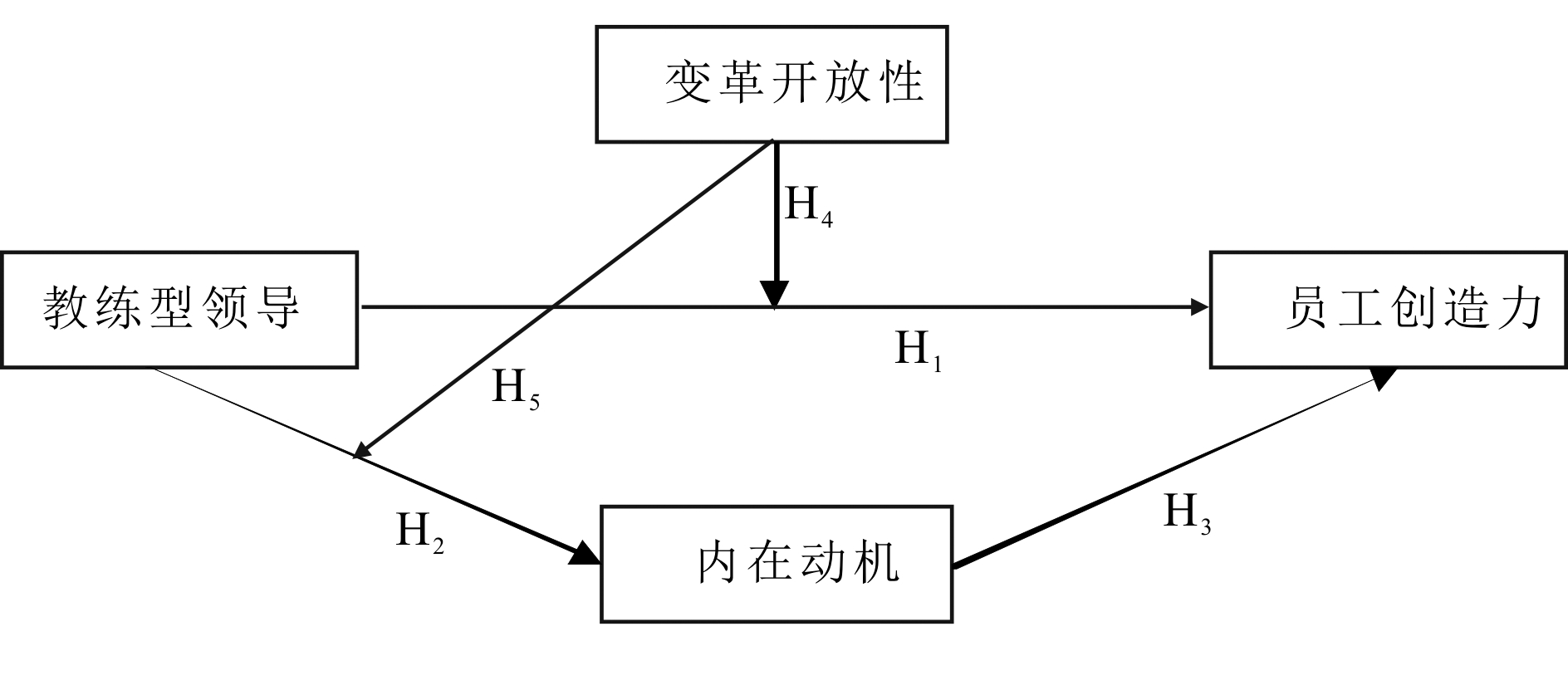 进一步地,高变革开放性的员工倾向于采取积极的应对策略,当管理者采取教练型领导风格对其进行引导和启发,并帮助其树立工作目标、挖掘其内在潜力时,他们往往会产生更强的内在驱动力,内在动机水平得到更大程度的提高,进而表现出更高的创造力水平。持低变革开放性的员工往往倾向于保持现状,尽量避免变革和创新带来的动荡与改变,因而教练型领导对其内在动机的激发作用可能会受到一定的限制,从而影响创造力水平提升。基于以上论述,本研究提出以下假设: