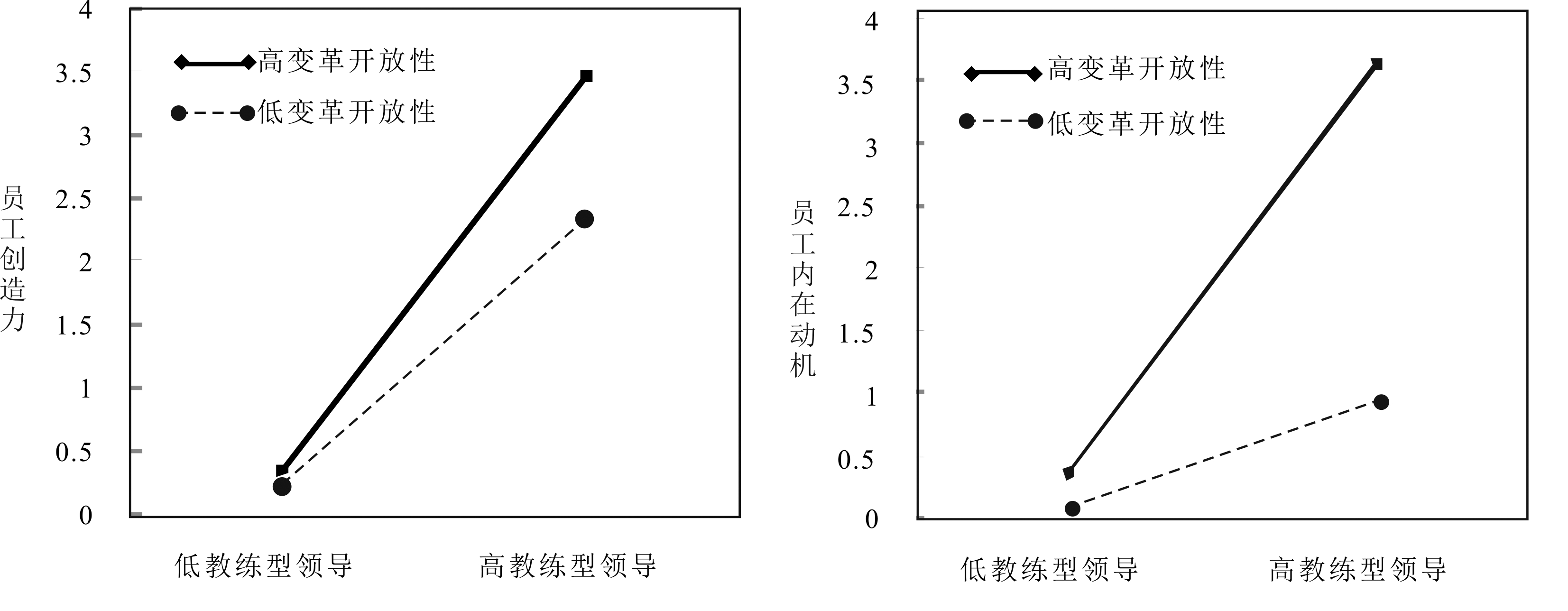 图2 变革开放性对教练型领导与员工创造力关系的调节效应 图3 变革开放性对教练型领导与员工内在动机关系的调节效应