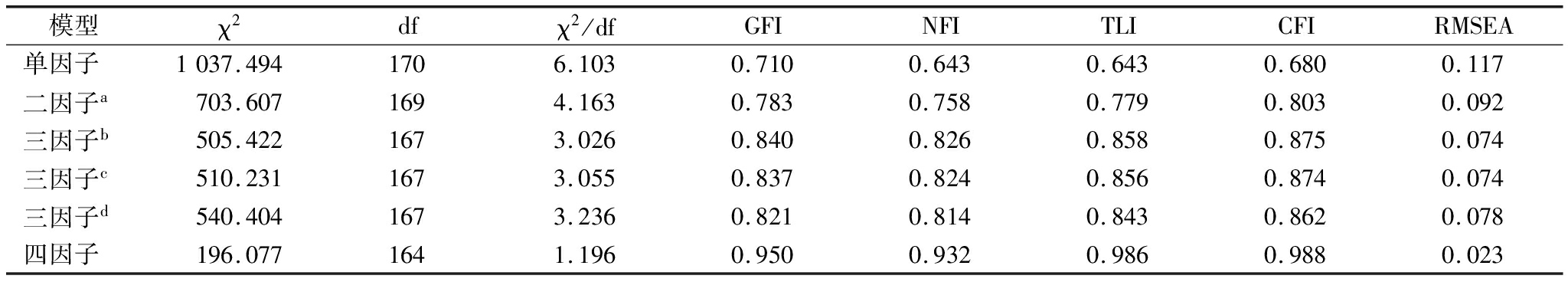 模型χ2dfχ2/dfGFINFITLICFIRMSEA单因子1037.4941706.1030.7100.6430.6430.6800.117二因子a703.6071694.1630.7830.7580.7790.8030.092三因子b505.4221673.0260.8400.8260.8580.8750.074三因子c510.2311673.0550.8370.8240.8560.8740.074三因子d540.4041673.2360.8210.8140.8430.8620.078四因子196.0771641.1960.9500.9320.9860.9880.023