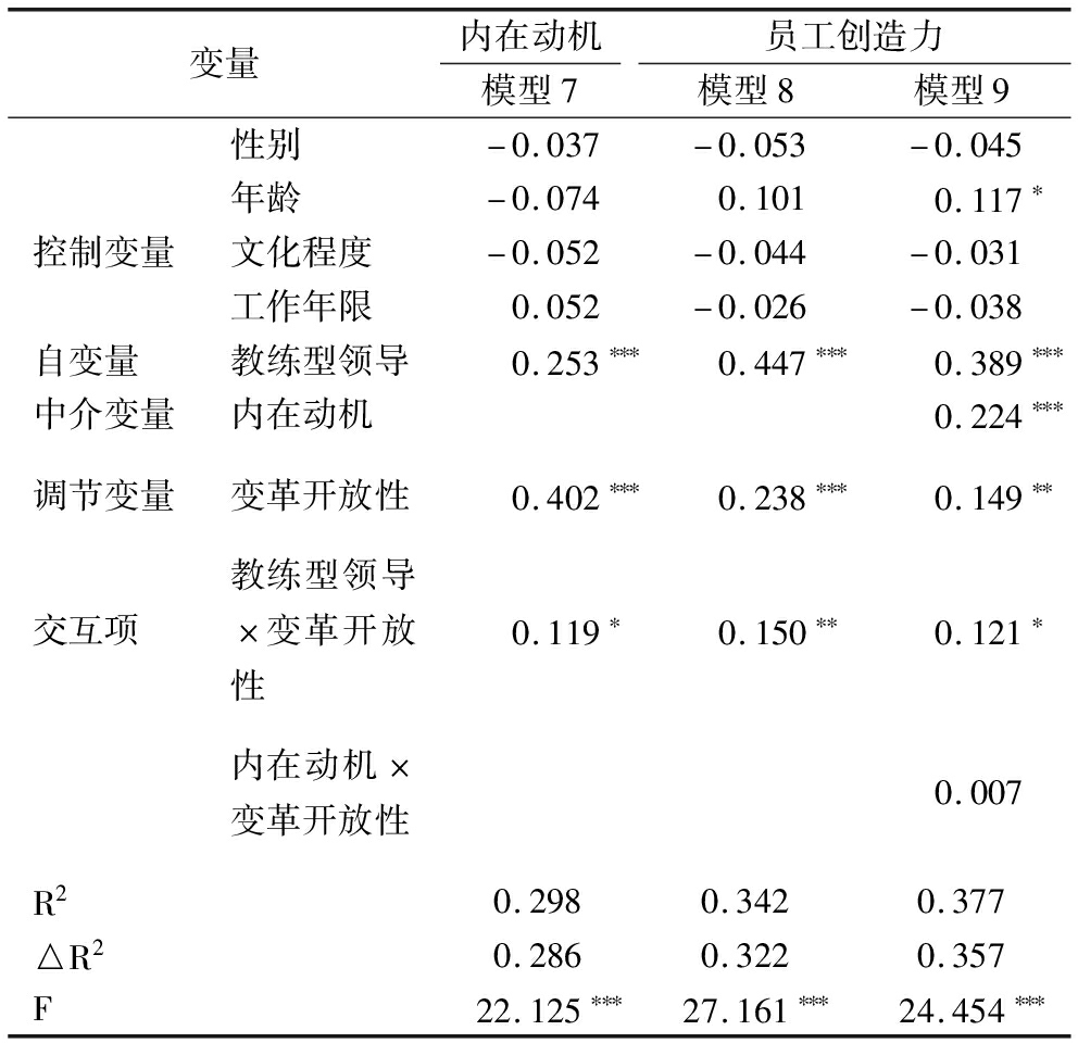 在检验数据的信效度之后,进行描述性统计分析,对研究假设进行初步检验,结果如表2所示。可以看出,教练型领导与内在动机、员工创造力均呈现出显著正相关关系(r=0.404,p<0.01;r=0.517,p<0.01);内在动机与员工创造力显著正相关(r=0.448,p<0.01)。描述性统计结果为本研究假设检验提供了初步支持。