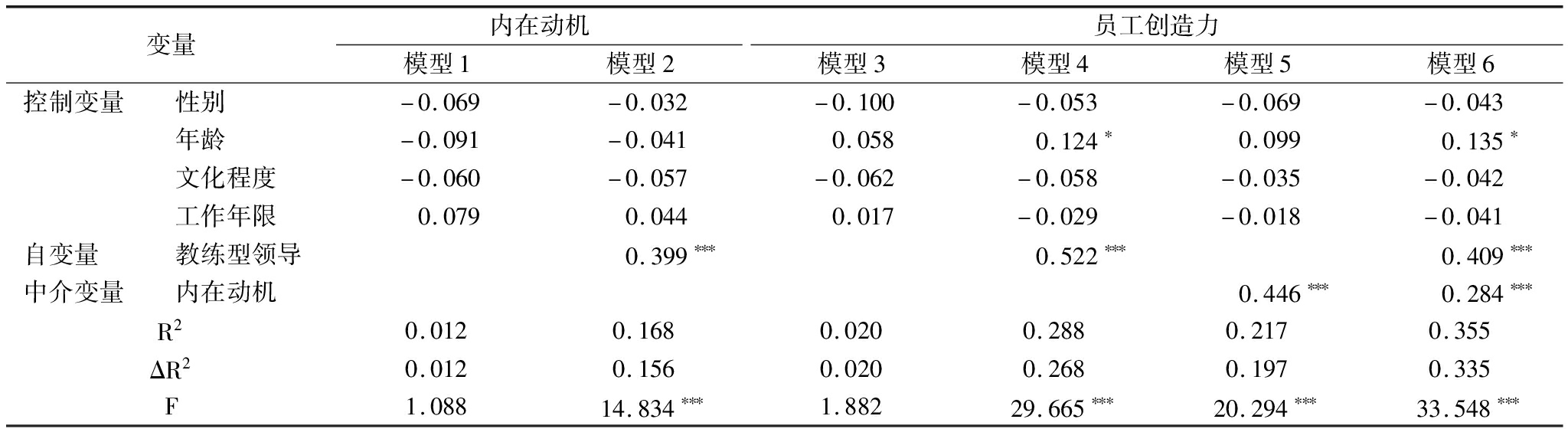 变量内在动机模型1模型2员工创造力模型3模型4模型5模型6控制变量性别-0.069-0.032-0.100-0.053-0.069-0.043年龄-0.091-0.0410.0580.124∗0.0990.135∗文化程度-0.060-0.057-0.062-0.058-0.035-0.042工作年限0.0790.0440.017-0.029-0.018-0.041自变量教练型领导0.399∗∗∗0.522∗∗∗0.409∗∗∗中介变量内在动机0.446∗∗∗0.284∗∗∗R20.0120.1680.0200.2880.2170.355ΔR20.0120.1560.0200.2680.1970.335F1.08814.834∗∗∗1.88229.665∗∗∗20.294∗∗∗33.548∗∗∗