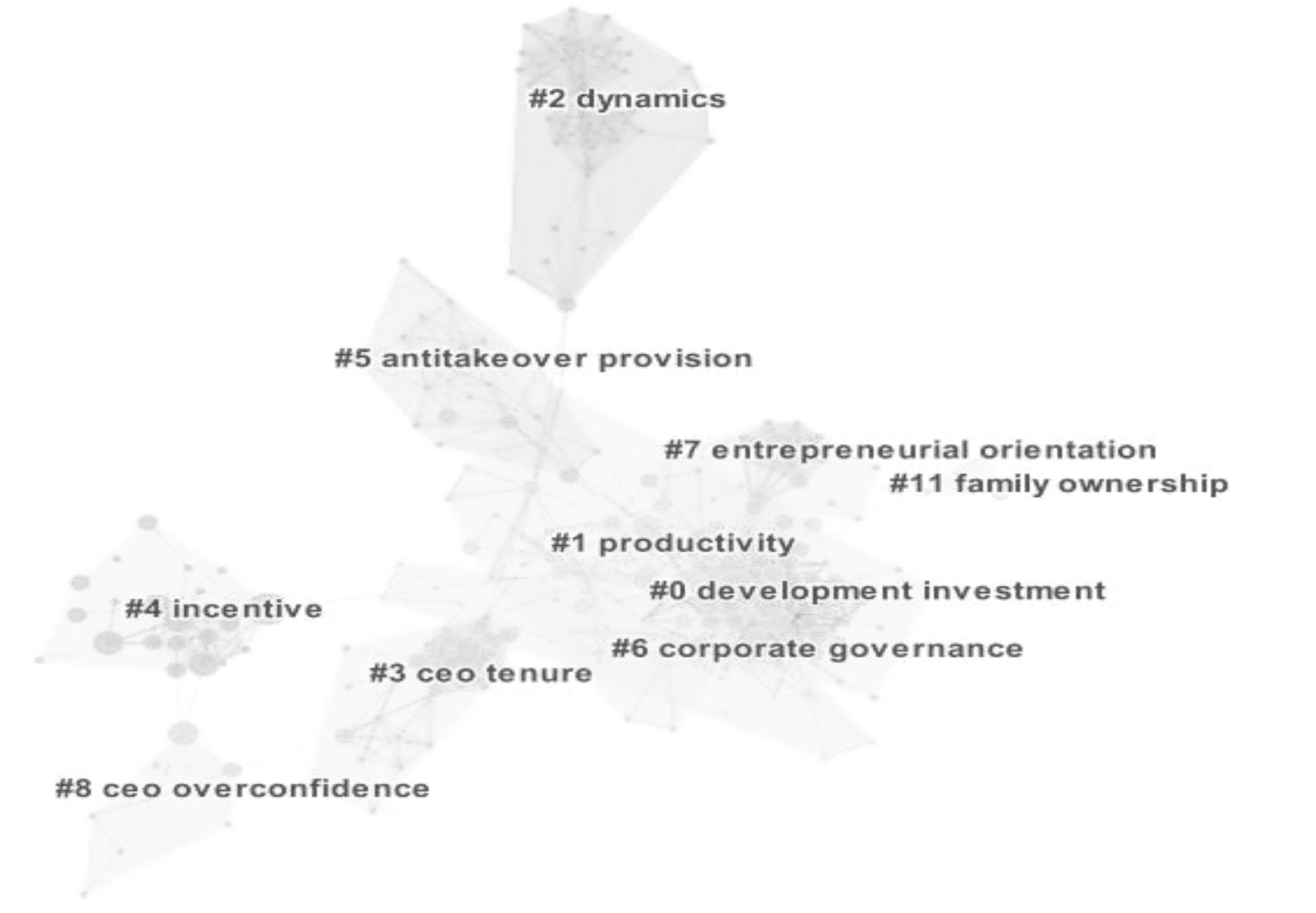 为进一步对共被引文献进行宏观分析,探索研究领域前沿,对所有引文数据进行聚类,得到10个聚类标签,如图4所示。10个聚类并非完全独立,而是通过连线存在一定的联系。根据聚类间连接不同,将聚类划分为3个研究视角:创新决策动态视角(聚类#0,#1,#2,#6)、特定股权背景视角(聚类#7,#11)、委托代理视角(聚类#3,#4,#5,#8)。