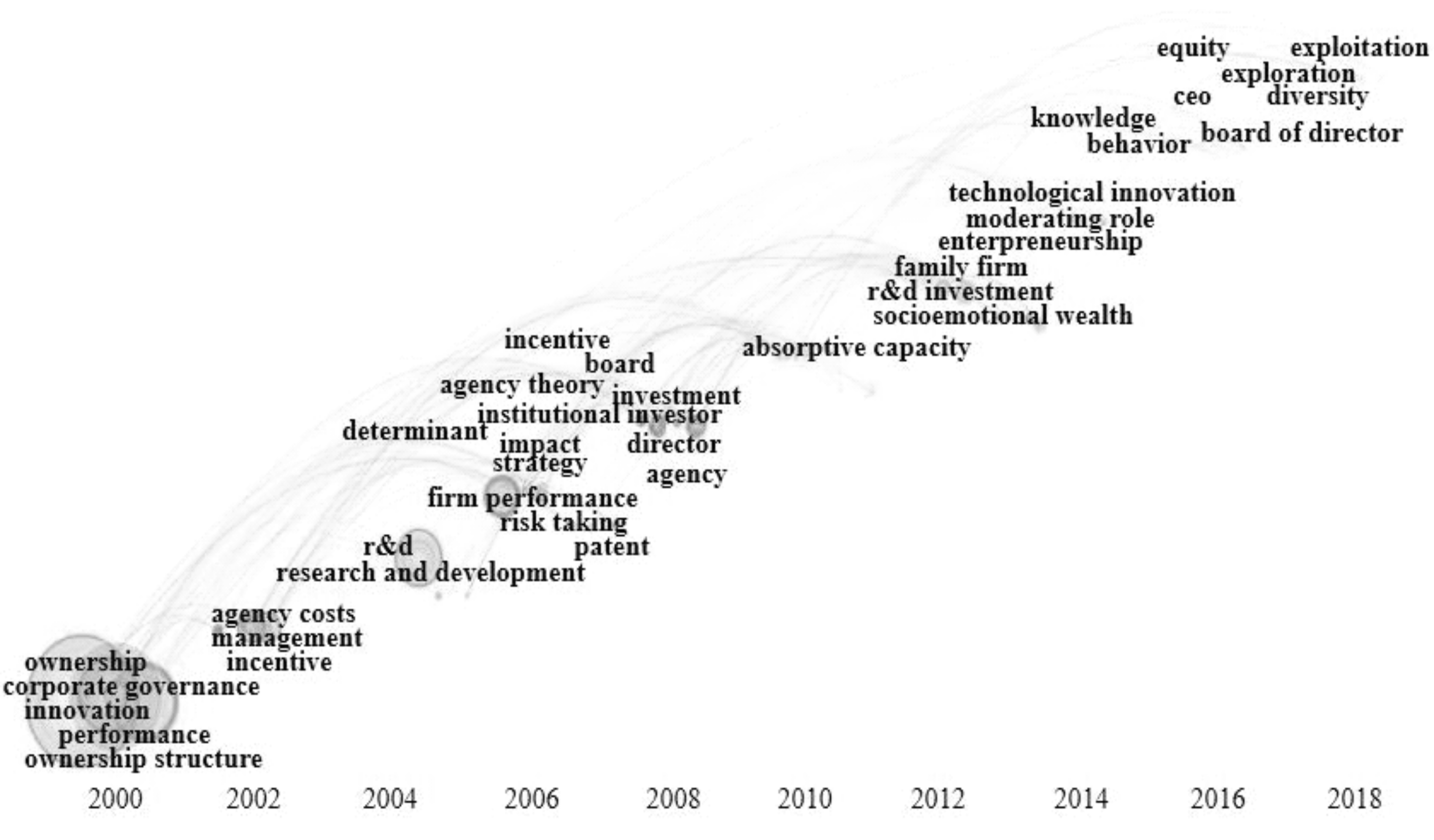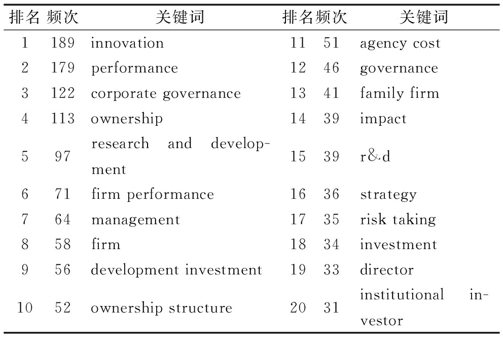 文献中频次最高的关键词是innovation(创新),属于该研究领域的核心主题。关键词performance(绩效)的频次数排在第二位,通常作为公司治理对创新活动影响的前提条件,不同绩效条件影响所有者作出不同的创新决策[6]。频次排在后面的关键词research and development(研发)、R&D(研发)、development investment(研发投资)分别代表创新过程和创新初始投入,是创新的必要条件。关键词risk taking(风险承担)描述了创新活动的高风险特点。关键词strategy(战略)代表创新是一项企业战略,企业创新战略制定受到不同所有权群体的影响,因此具有一定的复杂性和挑战性特征[8]。