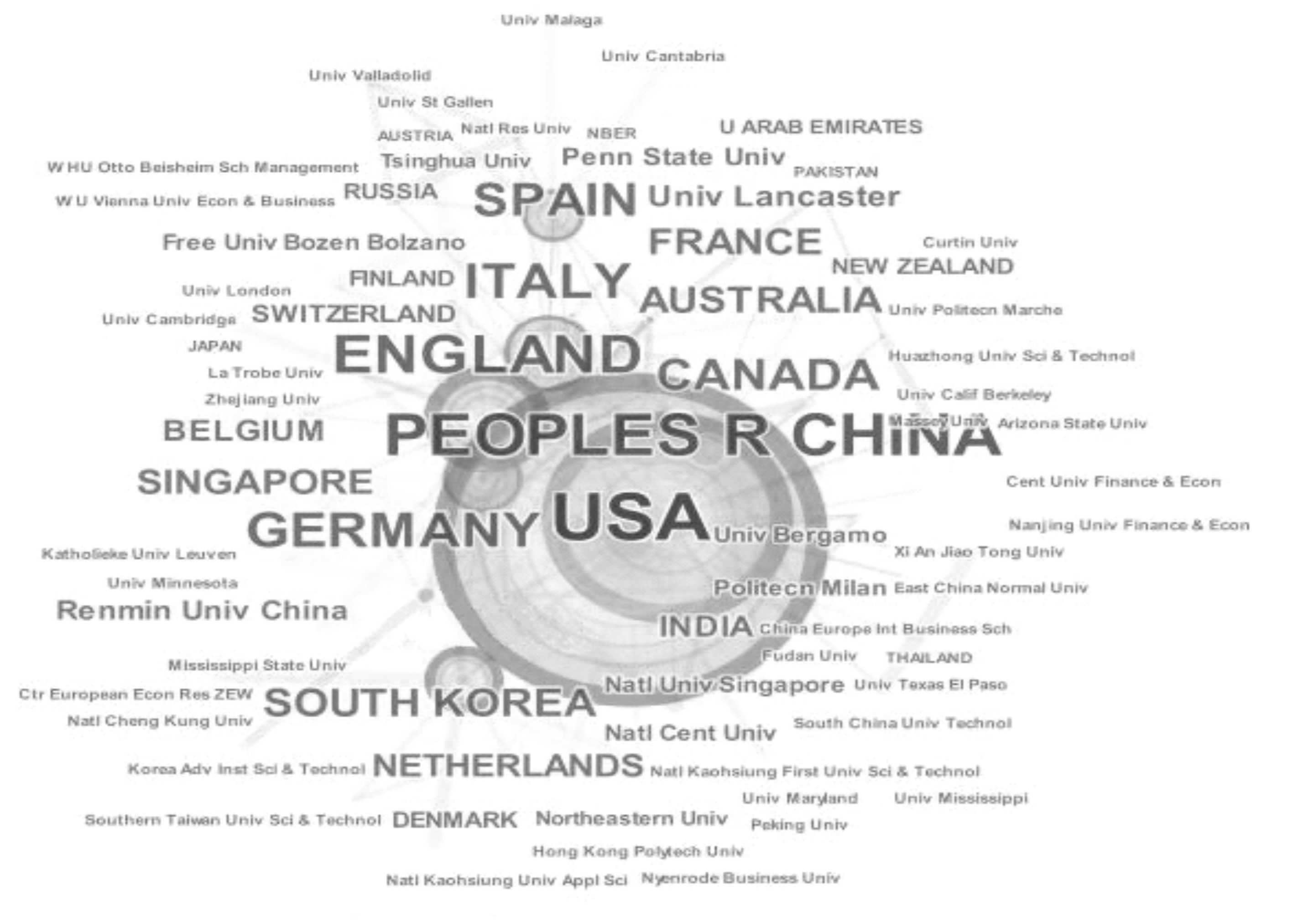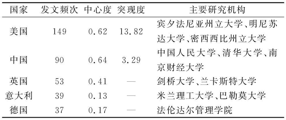 国家发文频次中心度突现度主要研究机构美国1490.6213.82宾夕法尼亚州立大学、明尼苏达大学、密西西比州立大学中国900.643.29中国人民大学、清华大学、南京财经大学英国530.41—剑桥大学、兰卡斯特大学意大利390.13—米兰理工大学、巴勒莫大学德国370.17—法伦达尔管理学院