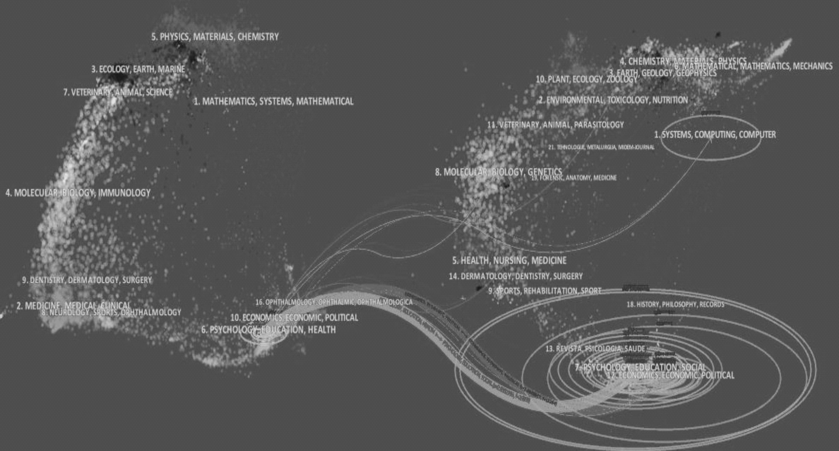 分析公司治理视角下企业创新领域研究所在期刊与被引用文献所在期刊学科变化可以了解期刊间的知识流动情况,拓展研究视野,而期刊双图叠加能够实现这一功能[11]。如图3所示,公司治理视角下企业创新研究来源期刊分布在左侧,圆圈所处位置为期刊所属学科,主要涉及经济学、政治学、心理学、健康学、教育学等学科。数据流线指向右侧被引用文献所在期刊,除经济学、政治学、教育学等学科外,还涉及社会学、历史学、哲学、档案学系统学以及计算学和计算机学等学科。由于公司治理作为一种制度安排,与社会经济发展及文化息息相关,离不开社会学、历史学等学科的理论铺垫,同时自然科学研究方法渗透到社会科学研究中,需要运用计算学等学科作为方法支撑,因此跨学科科研成果为公司治理视角下企业创新研究提供了一定的理论基础和研究方法,对该领域研究的创新和突破在于学科间的知识流动,不能局限于发文期刊所属学科领域。