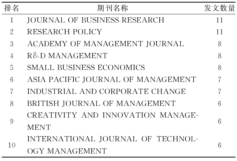 排名期刊名称发文数量1JOURNAL OF BUSINESS RESEARCH112RESEARCH POLICY113ACADEMY OF MANAGEMENT JOURNAL84R&D MANAGEMENT85SMALL BUSINESS ECONOMICS86ASIA PACIFIC JOURNAL OF MANAGEMENT77INDUSTRIAL AND CORPORATE CHANGE78BRITISH JOURNAL OF MANAGEMENT69CREATIVITY AND INNOVATION MANAGE-MENT610INTERNATIONAL JOURNAL OF TECHNOL-OGY MANAGEMENT6