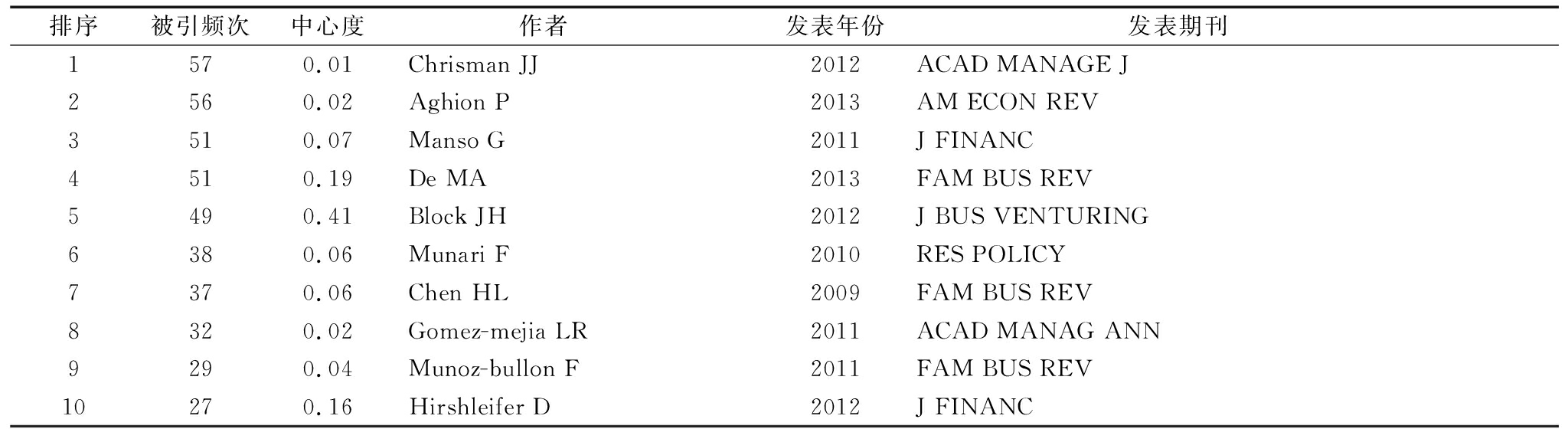 排序被引频次中心度作者 发表年份发表期刊 1570.01Chrisman JJ2012ACAD MANAGE J2560.02Aghion P2013AM ECON REV3510.07Manso G2011J FINANC4510.19De MA2013FAM BUS REV5490.41Block JH2012J BUS VENTURING6380.06Munari F2010RES POLICY7370.06Chen HL2009FAM BUS REV8320.02Gomez-mejia LR2011ACAD MANAG ANN9290.04Munoz-bullon F2011FAM BUS REV10270.16Hirshleifer D2012J FINANC