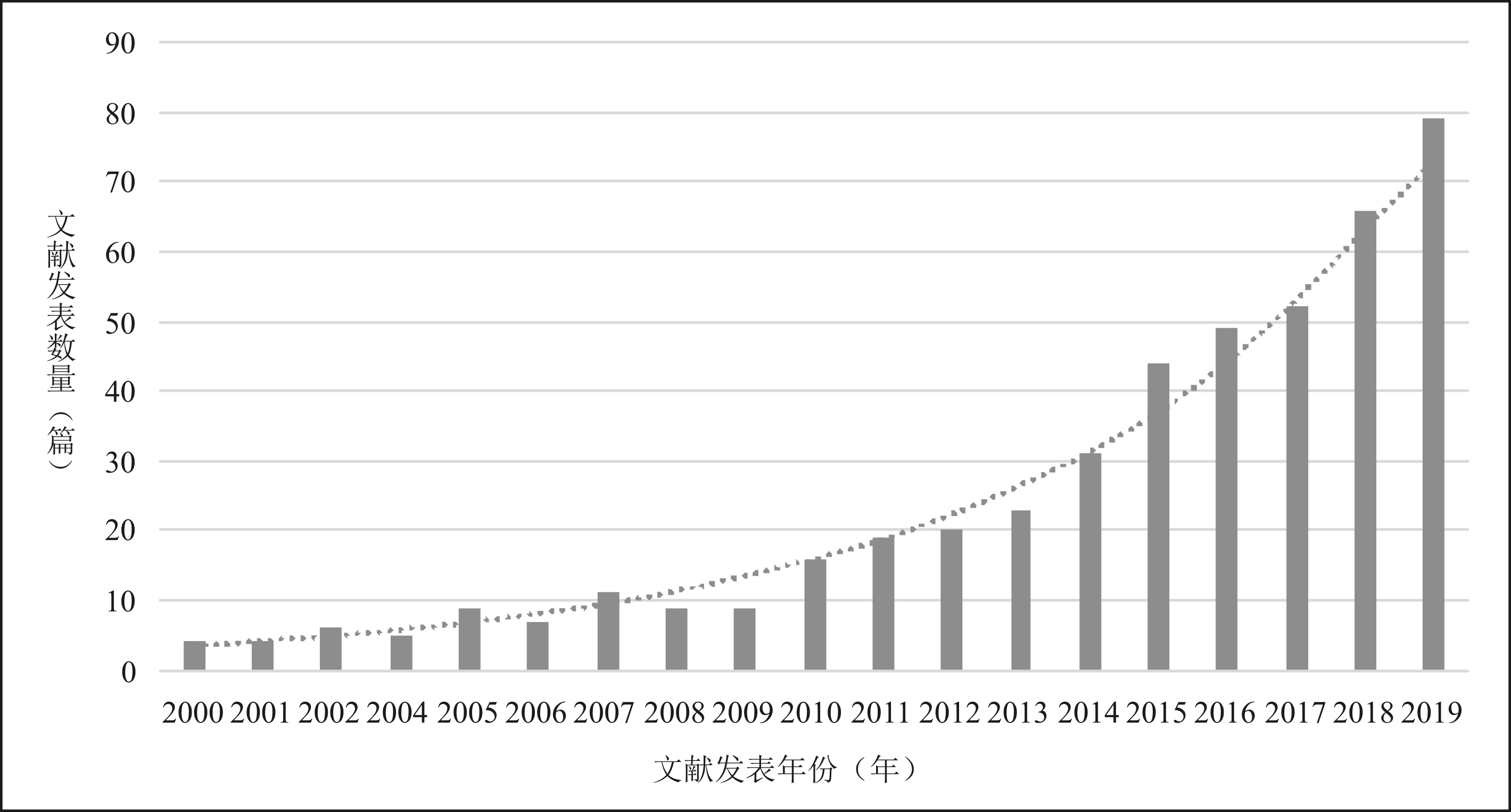 公司治理视角下企业创新研究发文数量可以衡量这一领域发展和受关注情况,文献数量时间分布见图1。从中可见,该领域文献呈现波动增长趋势,研究进程大致分为3个阶段:①第一阶段(2000-2010年)。该阶段每年文献数量在10篇上下波动,研究力度不大,表明10年内企业创新与公司治理关联研究进展比较缓慢,通过分别追溯公司治理研究和企业创新研究文献数量,发现这一阶段两类研究文献数量相对较少,因而影响了以公司治理理论和创新理论为基础的公司治理视角的企业创新研究进程;②第二阶段(2011- 2015年)。该阶段增长速度逐渐加快,特别是Chrisman于2012年《Academy of Management Journal》发表的文章将所有权和目标异质性丰富到代理理论中,引用较为频繁,加快了该领域研究进度,研究范围逐步扩大;③第三阶段(2016-2019年)。由于前两个阶段Chrisman、Hoskisson等的研究受到广泛关注,为这一领域打下了知识基础,因此第三阶段每年发文数量增长态势明显,2019年发文数量超过70篇,学者广泛探索了公司治理机制对企业创新的决定性作用,研究热度迅速提升。根据每年文献数量变化趋势,预计未来几年公司治理视角下企业创新研究发文数量会继续增长,并不断拓展研究深度和广度。