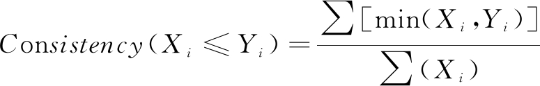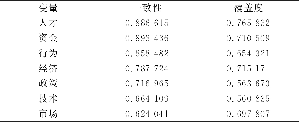 上式中,Xi表示案例样本在条件组合中的隶属度,Yi表示案例样本在结果中的隶属度,min指两者中的较小值[27]。通常规定,当0.8≤Consistency<0.9时,解释变量或组合被认为是结果变量的充分条件;当Consistency≥0.9时,解释变量或组合被认为是结果变量的必要条件[28]。