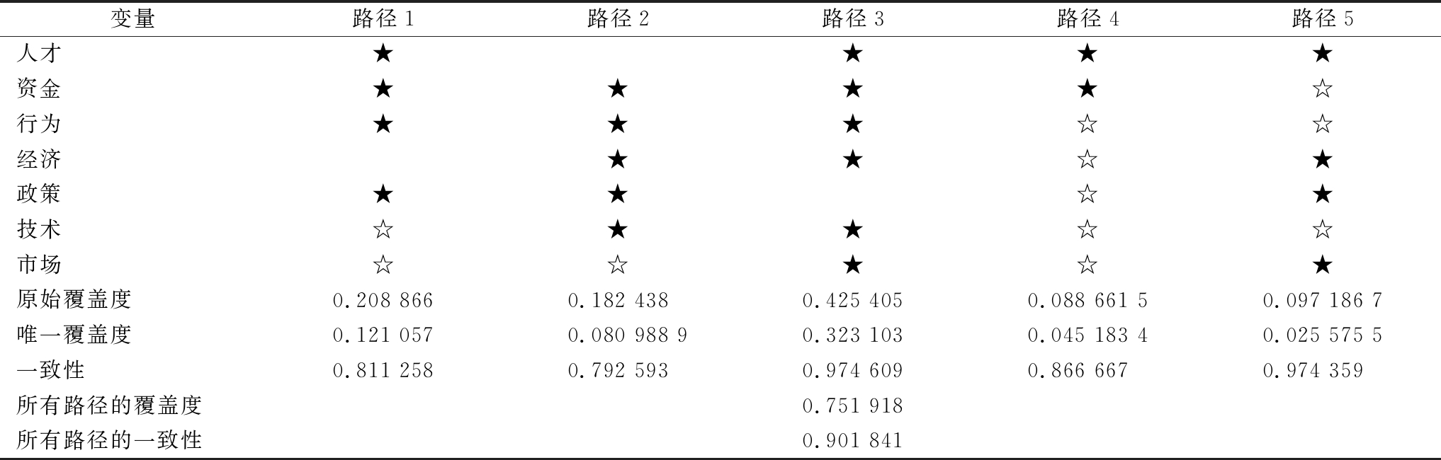 本文单变量必要性分析结果如表4所示,人才、资金和行为一致性介于0.8~0.9之间,说明这3个解释变量是众创空间创新发展的充分不必要条件。换言之,人才、资金和行为中的某一变量单独出现,有可能实现众创空间创新发展;反之,众创空间创新发展路径与方式并不局限于这三者,仍有其它路径与方式可寻。所有单个解释变量一致性均小于0.9,说明这些解释变量需要组合在一起,才能构成众创空间创新发展的必要条件,从而共同促进众创空间创新发展。因此,有必要进行多变量组态分析。