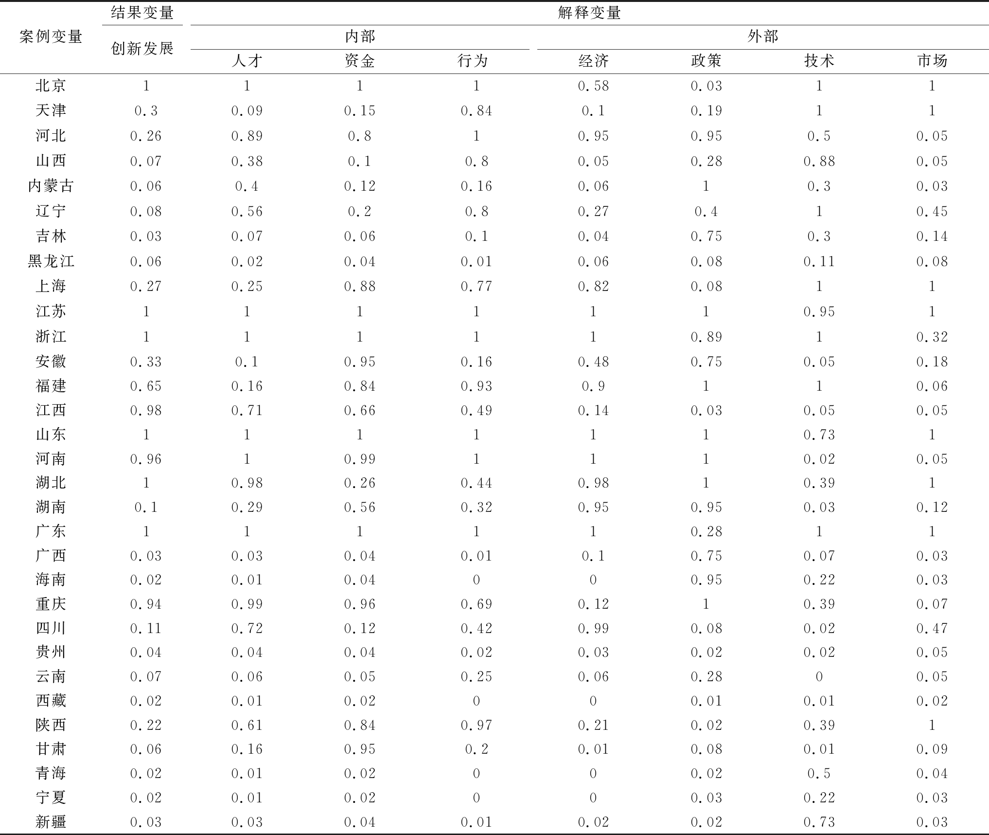 案例变量结果变量创新发展解释变量内部人才资金行为外部经济政策技术市场北京11110.580.0311天津0.30.090.150.840.10.1911河北0.260.890.810.950.950.50.05山西0.070.380.10.80.050.280.880.05内蒙古0.060.40.120.160.0610.30.03辽宁0.080.560.20.80.270.410.45吉林0.030.070.060.10.040.750.30.14黑龙江0.060.020.040.010.060.080.110.08上海0.270.250.880.770.820.0811江苏1111110.951浙江111110.8910.32安徽0.330.10.950.160.480.750.050.18福建0.650.160.840.930.9110.06江西0.980.710.660.490.140.030.050.05山东1111110.731河南0.9610.991110.020.05湖北10.980.260.440.9810.391湖南0.10.290.560.320.950.950.030.12广东111110.2811广西0.030.030.040.010.10.750.070.03海南0.020.010.04000.950.220.03重庆0.940.990.960.690.1210.390.07四川0.110.720.120.420.990.080.020.47贵州0.040.040.040.020.030.020.020.05云南0.070.060.050.250.060.2800.05西藏0.020.010.02000.010.010.02陕西0.220.610.840.970.210.020.391甘肃0.060.160.950.20.010.080.010.09青海0.020.010.02000.020.50.04宁夏0.020.010.02000.030.220.03新疆0.030.030.040.010.020.020.730.03