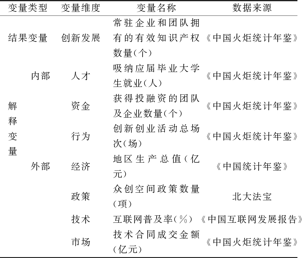 通过借鉴其他学者关于众创空间创新发展影响因素的研究,本文兼顾内部与外部因素,依据公开性与相关性原则,选取7个解释变量分别代表7个维度。其中,以“吸纳应届大学生就业人数”代表“人才”的原因是,大学生具备较为前沿的创新理念、完备的知识体系、高效的学习效率,能够适应众创空间快速的工作节奏,是众创空间及常驻企业和团队人才储备的重要组成部分。并且,《中国火炬统计年鉴》将该指标单独统计,足见对大学生人才的重视,因此用该指标代表“人才”具备一定的现实依据;以“获得投融资的团队及企业数量”代表“资金”的原因是,众创空间的“众”意指大众万众,表征为创新主体来源的广泛性,以及创新资源配置的公平性、平等性和普遍性,获得投融资的团队及企业数量越大,说明投融资覆盖对象越广、普遍性越强,因此该指标能够衡量资金配置集散程度;以“创新创业活动总场次”代表“行为”的原因是,众创空间主要是促进“大众创业万众创新”,其行为应是开展各类创新创业活动,如培训讲座、信息咨询、资源聚合等;以“地区生产总值”代表“经济”的原因是,地区生产总值能够衡量当地经济发展总体概况;以“众创空间政策数量”代表“政策”的原因是,专项政策数量是测量众创空间政策供给情况的直接指标,政策数量越多一般表示政策供给越充分;以“互联网普及率”代表“技术”的原因是,互联网作为一种现代信息技术,为生产和生活方式带来了颠覆式变革,并且互联网技术使得虚拟化组织形态、开放化办公场地、精准化孵化模式等成为可能,因此互联网是众创空间产生与发展的重要技术手段,而互联网普及率则是衡量这项技术推广与应用的直接指标;以“技术合同成交金额”代表“市场”的原因是,该指标体现了技术源头研发到技术转移转化的技术市场交易情况,通常而言技术合同成交金额越大,表示技术交易市场越为活跃。