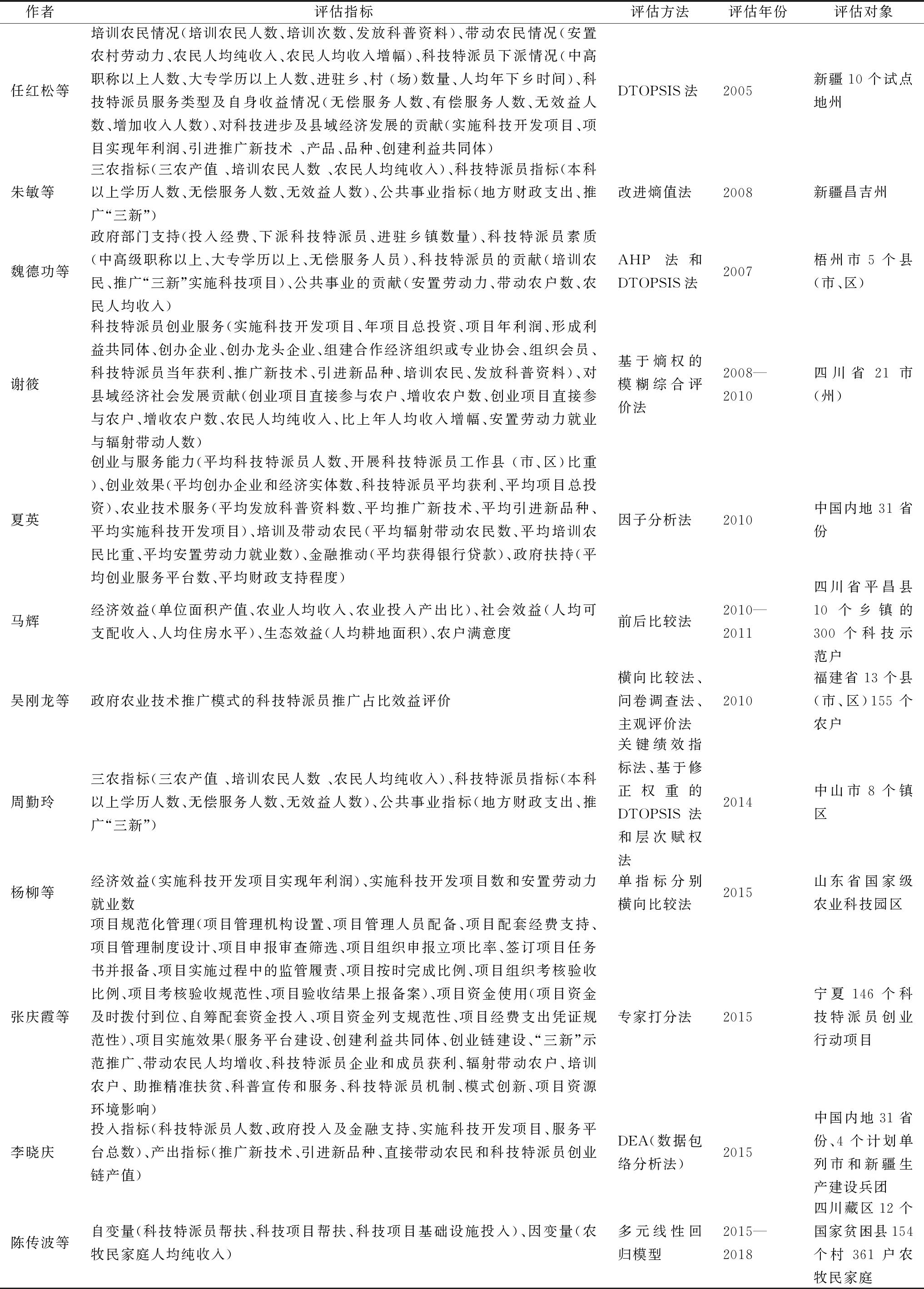 作者评估指标评估方法评估年份评估对象任红松等培训农民情况(培训农民人数、培训次数、发放科普资料)、带动农民情况(安置农村劳动力、农民人均纯收入、农民人均收入增幅)、科技特派员下派情况(中高职称以上人数、大专学历以上人数、进驻乡、村 (场)数量、人均年下乡时间)、科技特派员服务类型及自身收益情况(无偿服务人数、有偿服务人数、无效益人数、增加收入人数)、对科技进步及县域经济发展的贡献(实施科技开发项目、项目实现年利润、引进推广新技术 、产品、品种、创建利益共同体)DTOPSIS法2005新疆10个试点地州朱敏等三农指标(三农产值 、培训农民人数 、农民人均纯收入)、科技特派员指标(本科以上学历人数、无偿服务人数、无效益人数)、公共事业指标(地方财政支出、推广“三新”)改进熵值法2008新疆昌吉州魏德功等政府部门支持(投入经费、下派科技特派员、进驻乡镇数量)、科技特派员素质(中高级职称以上、大专学历以上、无偿服务人员)、科技特派员的贡献(培训农民、推广“三新”实施科技项目)、公共事业的贡献(安置劳动力、带动农户数、农民人均收入)AHP法和DTOPSIS法2007梧州市5个县(市、区)谢筱科技特派员创业服务(实施科技开发项目、年项目总投资、项目年利润、形成利益共同体、创办企业、创办龙头企业、组建合作经济组织或专业协会、组织会员、科技特派员当年获利、推广新技术、引进新品种、培训农民、发放科普资料)、对县域经济社会发展贡献(创业项目直接参与农户、增收农户数、创业项目直接参与农户、增收农户数、农民人均纯收入、比上年人均收入增幅、安置劳动力就业与辐射带动人数)基于熵权的模糊综合评价法2008—2010四川省21市(州)夏英创业与服务能力(平均科技特派员人数、开展科技特派员工作县 (市、区)比重 )、创业效果(平均创办企业和经济实体数、科技特派员平均获利、平均项目总投资)、农业技术服务(平均发放科普资料数、平均推广新技术、平均引进新品种、平均实施科技开发项目)、培训及带动农民(平均辐射带动农民数、平均培训农民比重、平均安置劳动力就业数)、金融推动(平均获得银行贷款)、政府扶持(平均创业服务平台数、平均财政支持程度)因子分析法2010中国内地 31 省 份马辉经济效益(单位面积产值、农业人均收入、农业投入产出比)、社会效益(人均可支配收入、人均住房水平)、生态效益(人均耕地面积)、农户满意度前后比较法2010—2011四川省平昌县10个乡镇的300个科技示范户吴刚龙等政府农业技术推广模式的科技特派员推广占比效益评价横向比较法、问卷调查法、主观评价法2010福建省13个县(市、区)155个农户周勤玲三农指标(三农产值 、培训农民人数 、农民人均纯收入)、科技特派员指标(本科以上学历人数、无偿服务人数、无效益人数)、公共事业指标(地方财政支出、推广“三新”)关键绩效指标法、基于修正权重的DTOPSIS法和层次赋权法2014中山市8个镇区杨柳等经济效益(实施科技开发项目实现年利润)、实施科技开发项目数和安置劳动力就业数单指标分别横向比较法2015山东省国家级农业科技园区张庆霞等项目规范化管理(项目管理机构设置、项目管理人员配备、项目配套经费支持、项目管理制度设计、项目申报审查筛选、项目组织申报立项比率、签订项目任务书并报备、项目实施过程中的监管履责、项目按时完成比例、项目组织考核验收比例、项目考核验收规范性、项目验收结果上报备案)、项目资金使用(项目资金及时拨付到位、自筹配套资金投入、项目资金列支规范性、项目经费支出凭证规范性)、项目实施效果(服务平台建设、创建利益共同体、创业链建设、“三新”示范推广、带动农民人均增收、科技特派员企业和成员获利、辐射带动农户、培训农户、 助推精准扶贫、科普宣传和服务、科技特派员机制、模式创新、项目资源环境影响)专家打分法2015宁夏146个科技特派员创业行动项目李晓庆投入指标(科技特派员人数、政府投入及金融支持、实施科技开发项目、服务平台总数)、产出指标(推广新技术、引进新品种、直接带动农民和科技特派员创业链产值)DEA(数据包络分析法)2015中国内地31省份、4个计划单列市和新疆生产建设兵团陈传波等自变量(科技特派员帮扶、科技项目帮扶、科技项目基础设施投入)、因变量(农牧民家庭人均纯收入)多元线性回归模型2015—2018四川藏区12个国家贫困县154个村 361户农牧民家庭