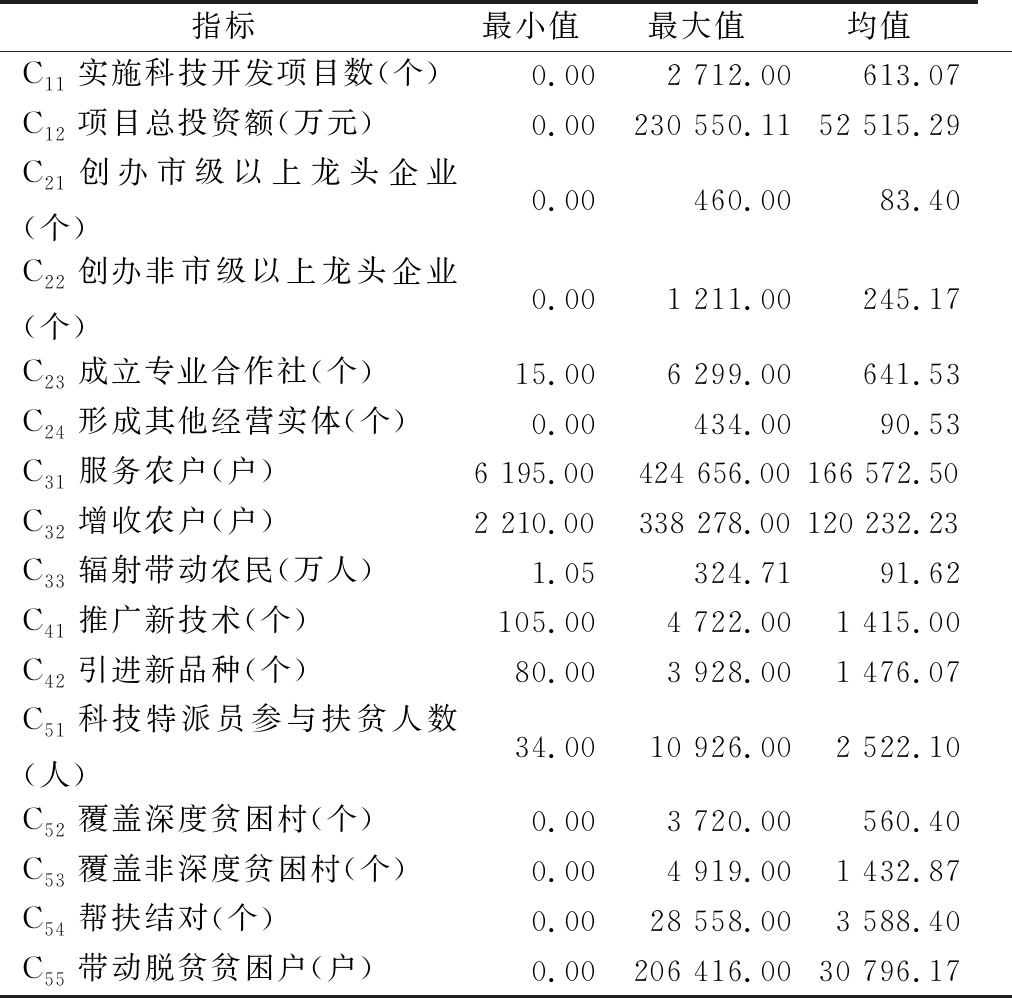 指标最小值最大值均值C11实施科技开发项目数(个)0.002 712.00 613.07C12项目总投资额(万元)0.00230 550.11 52 515.29 C21创办市级以上龙头企业(个)0.00460.0083.40C22创办非市级以上龙头企业(个)0.001 211.00 245.17C23成立专业合作社(个)15.00 6 299.00 641.53C24形成其他经营实体(个)0.00434.0090.53C31服务农户(户)6 195.00 424 656.00 166 572.50 C32增收农户(户)2 210.00 338 278.00 120 232.23C33辐射带动农民(万人)1.05324.7191.62C41推广新技术(个)105.004 722.00 1 415.00 C42引进新品种(个)80.003 928.00 1 476.07 C51科技特派员参与扶贫人数(人)34.0010 926.00 2 522.10 C52覆盖深度贫困村(个)0.003 720.00 560.40C53覆盖非深度贫困村(个)0.004 919.00 1 432.87 C54帮扶结对(个)0.0028 558.00 3 588.40 C55带动脱贫贫困户(户)0.00206 416.00 30 796.17