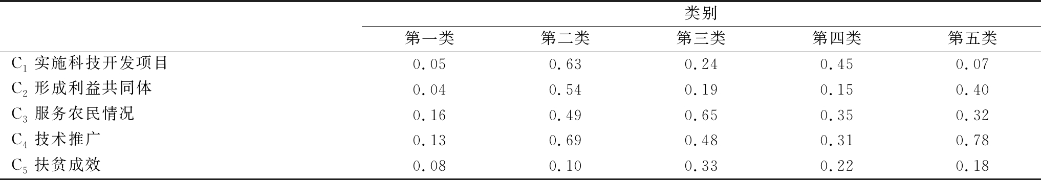 类别第一类第二类第三类第四类第五类C1实施科技开发项目0.050.630.240.450.07C2形成利益共同体0.040.540.190.150.40C3服务农民情况0.160.490.650.350.32C4技术推广0.130.690.480.310.78C5扶贫成效0.080.100.330.220.18