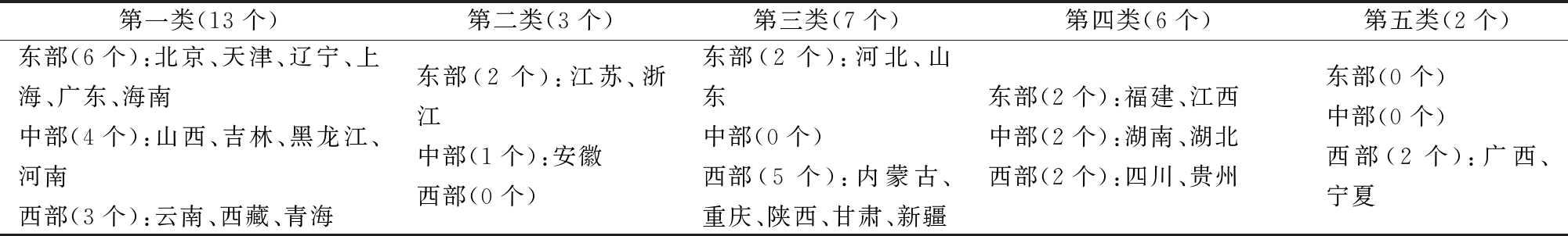 第一类(13个)第二类(3个)第三类(7个)第四类(6个)第五类(2个)东部(6个):北京、天津、辽宁、上海、广东、海南中部(4个):山西、吉林、黑龙江、河南西部(3个):云南、西藏、青海东部(2个):江苏、浙江中部(1个):安徽西部(0个)东部(2个):河北、山东中部(0个)西部(5个):内蒙古、重庆、陕西、甘肃、新疆东部(2个):福建、江西中部(2个):湖南、湖北西部(2个):四川、贵州东部(0个)中部(0个)西部(2个):广西、宁夏
