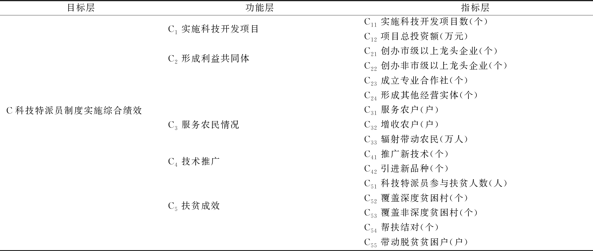 目标层功能层指标层C1实施科技开发项目C11实施科技开发项目数(个)C12项目总投资额(万元)C2形成利益共同体C21创办市级以上龙头企业(个)C22创办非市级以上龙头企业(个)C23成立专业合作社(个)C24形成其他经营实体(个)C科技特派员制度实施综合绩效C3服务农民情况C31服务农户(户)C32增收农户(户)C33辐射带动农民(万人)C4技术推广C41推广新技术(个)C42引进新品种(个)C5扶贫成效C51科技特派员参与扶贫人数(人)C52覆盖深度贫困村(个)C53覆盖非深度贫困村(个)C54帮扶结对(个)C55带动脱贫贫困户(户)