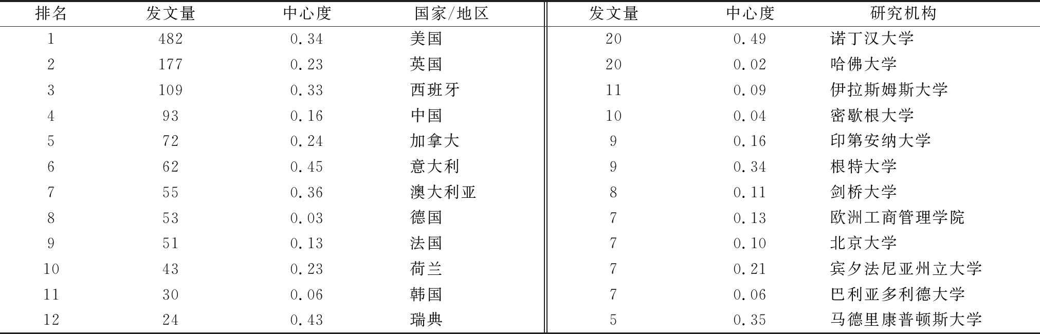 由于知识增长的动态性、科学发展的复杂性以及领域知识的专业性,使得个体学者在科研过程中很难获取所有研究资源与专业知识,必须通过广泛的科研合作,有效解决日趋复杂的科学问题。鉴于此,本文对现有文献进行主要国家(地区)与研究机构之间的合作分析,以识别该领域的核心研究机构与国家,从而在之后的科研过程中加强与其之间的协作交流,实现自身科研水平快速提升。通过CitespaceV得到国家(地区)与研究机构混合网络图谱,如图2所示。对该网络图谱进行汇总,得到国家(地区)与研究机构发文量(Top12)列表,如表2所示。